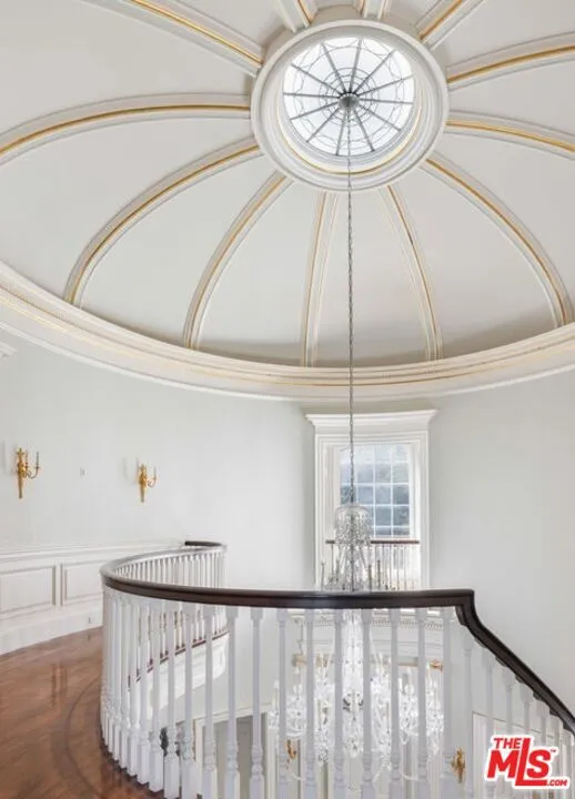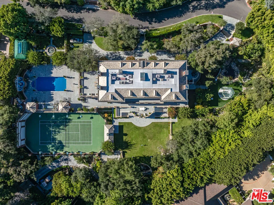 Tucked behind Bel-Air’s coveted East Gate, Rosewood is an extraordinary Georgian residence designed by acclaimed architect Richard Manion. Set on 1.51 acres of meticulously manicured grounds, the estate offers roughly 23,000 square feet of classic, refined living space. A gated circular drive leads to an impressive red-brick exterior, accented with limestone, traditional columns, custom moldings and elegant blue shutters. Stepping inside, guests are greeted by a dramatic foyer crowned with an oval skylight dome that casts natural light across the black-and-white marble floors and a sweeping spiral staircase. The formal living and dining rooms showcase soaring ceilings, detailed millwork, marble fireplaces, and expansive French doors that frame views of the surrounding gardens. A custom mahogany office with coffered ceilings provides an elegant private workspace. The gourmet chef’s kitchen is equipped with marble surfaces, bespoke cabinetry, high-end appliances, a striking central island, and a full butler’s pantry. It opens seamlessly to relaxed living and dining areas that spill onto a wraparound terrace perfect for hosting. Upstairs, the primary suite features a private sitting room, terrace access, fireplace, dual marble bathrooms, and generous walk-in closets. Four additional guest suites complete the level. The lower level is dedicated to entertainment and wellness, offering a guest suite, gym, massage room, wine cellar, secondary kitchen, and a remarkable oak-paneled ballroom with a stage and bar capable of accommodating up to 120 guests. The outdoor spaces evoke the feel of a private resort, complete with a North/South championship tennis court, pool and spa, fountains, gazebo, conservatory, treehouse, expansive lawns, and multiple al fresco entertaining areas equipped with a built-in bar and BBQ. Beneath it all, a showroom-style level provides parking for up to 12 cars, a nostalgic soda fountain diner, staff quarters, elevator access, enhanced security systems, and significant storage. Rosewood stands as a rare chance to live in a true landmark estate in one of LA’s most esteemed neighborhoods.