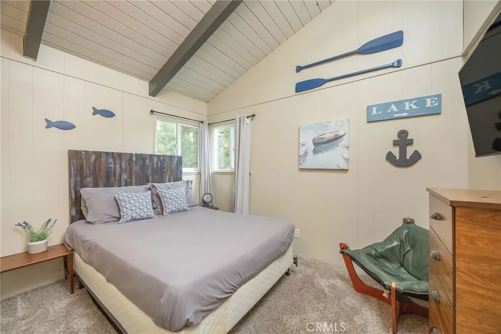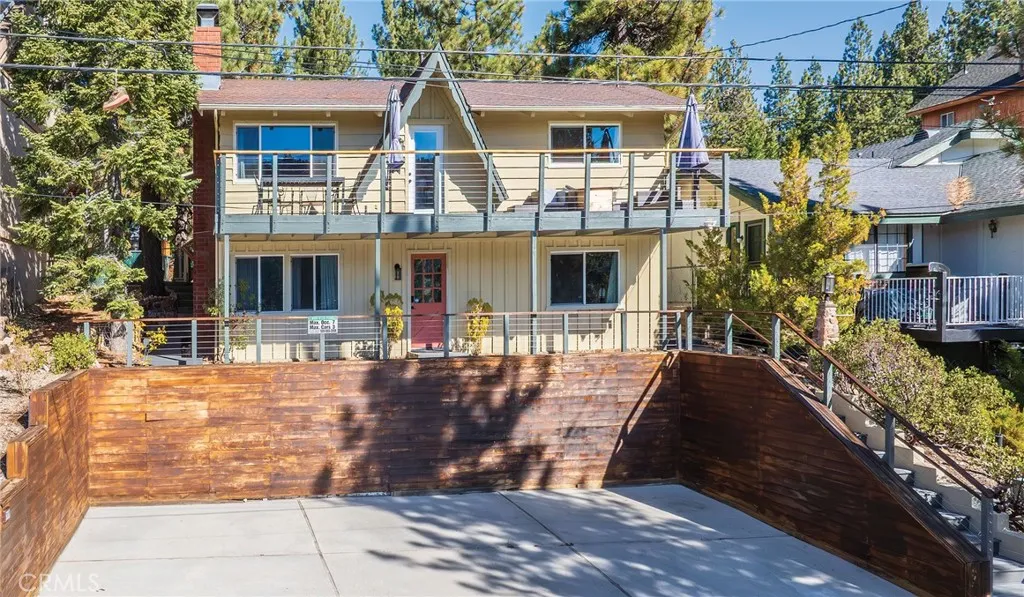 Escape to the beauty of Boulder Bay and discover a home filled with charm, warmth, and inviting views of the lake and distinctive rock formations—offering the sense of “Happy Use” from the moment you arrive. You enter into the lively bunk/game room, a flexible, fun-filled space with a stone fireplace, TV, foosball table & convenient ½ bath, setting a playful mountain vibe. The spacious primary bedroom, styled with a whimsical lake theme, offers a relaxed retreat after a day of adventure. Head upstairs to the bright great room, where vaulted ceilings & a classic brick fireplace create an inviting mountain atmosphere. Throughout the home, upgraded windows, wood-style flooring & central air conditioning enhance comfort & style. A beautiful live-edge dining bar adds natural artistry & a welcoming spot for casual meals or AM coffee. Sunlight fills the space, revealing sweet lake views—a delightful daily treat—enjoyed best from both the great room & the upper front deck. The home features composite decking & sleek cable-style railing that complement the home’s modern mountain appeal. This outdoor area offers space for dining & relaxation, with the sparkle of Boulder Bay making it a a wonderful extension of the Great Room, enhancing outdoor enjoyment. The kitchen features stainless appliances & solid-surface counters, while both bathrooms include updated fixtures & vanities accented with shiplap. The upstairs bathroom is a standout featuring a custom-subway tile shower with striking penny-tile flooring, adding a fresh & modern touch. Just off the great room, the upstairs laundry room—with washer/dryer, pantry shelving, storage cabinets & a fun Dutch-style interior door—adds convenience and access to the rear yard. The fenced rear yard offers a great place to relax, entertain & take in Big Bear’s star-filled night sky. Southern exposure brightens the spaces & accelerates snow melt, while the level concrete parking area makes year-round arrival & departure easier. Offering 3 bedrooms plus the bunk/game room, this is a fantastic place to gather with friends & family. Most of the furnishings are available so you can start your Big Bear adventure right away. Walk, ride or roll to Pleasure Point Marina & lake access—just minutes away—with the Village & resorts a short drive. Wonderful for weekend escapes, full-time living or a productive income opportunity, this Boulder Bay home delivers comfort, character & a welcoming mountain-lake lifestyle.