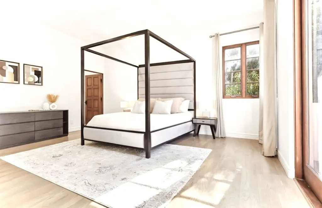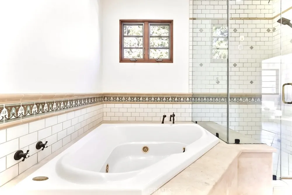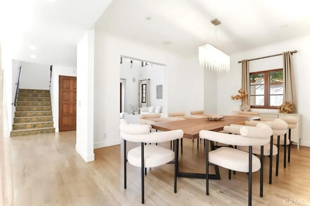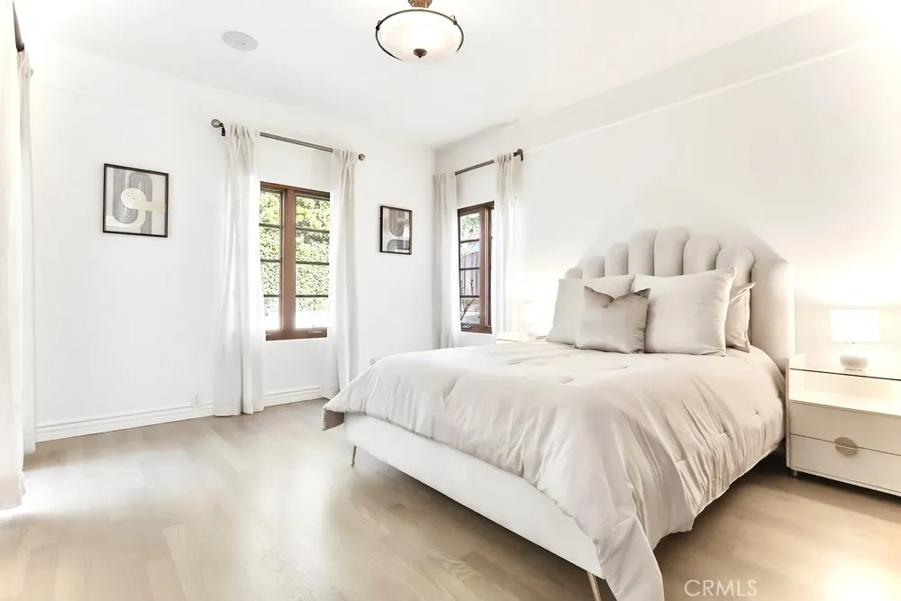 A versatile en-suite bedroom with its own entrance serves perfectly as an office, guest suite, or creative studio. Upstairs, generously scaled guest rooms accompany a serene primary retreat with vaulted ceilings, expansive closet space, and a spa-inspired bath. The backyard is the home’s crown jewel—a true resort-style sanctuary with a large pool, spa, fire pit lounge, and full outdoor wet bar, all wrapped in lush greenery that ensures exceptional seclusion rarely found in this central Hollywood location.
