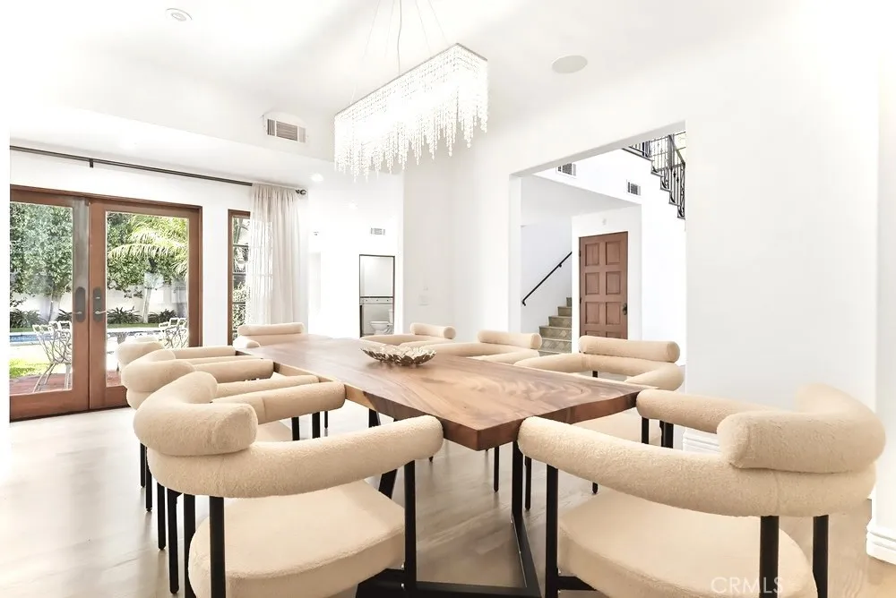 A grand foyer opens into sun-filled living spaces framed by soaring ceilings, graceful archways, and multiple sets of French doors that invite natural light and connect seamlessly to the outdoors. The formal living and dining rooms flow effortlessly into a spacious chef’s kitchen and adjoining family room, offering an ideal environment for both everyday living and elegant entertaining.