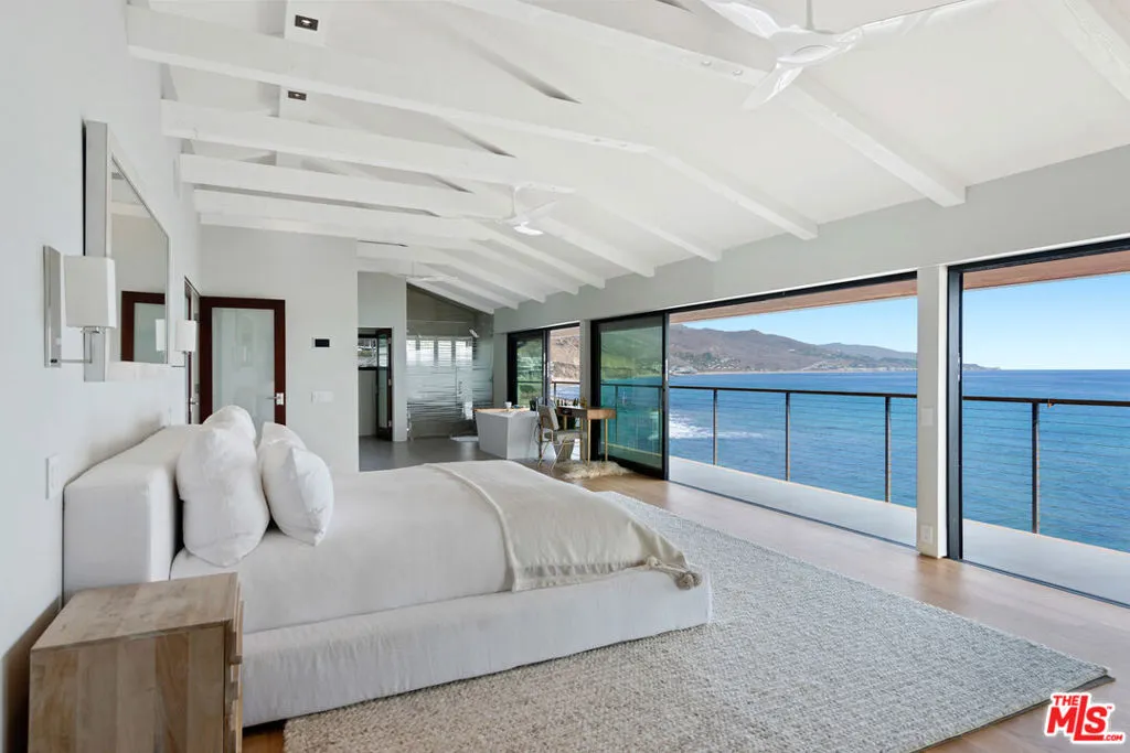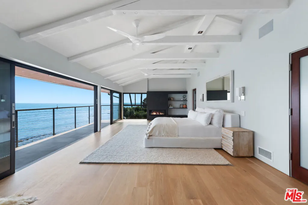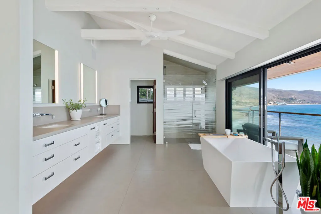 Updated contemporary on a double lot with rare 100 ocean frontage and a large landscaped lawn with hammock and a wood-and-glass sauna, perfect for lounging, dining, or working, and a detached guest room with a queen-sized bed and a 1/2 bathroom. A luminous entry hall to the surf break and non-stop ocean panorama, this stunning beach home with seamless indoor-outdoor flow, sensational views, and gorgeous open-plan design has everything you could possibly want for living the Malibu lifestyle. A private haven that is ideal for tranquil relaxation and sophisticated entertaining on a gorgeous cove with direct beach access, this special corner of paradise features wraparound decks, exceptionally high ceilings, skylights, enormous walls of glass facing onto the views, and beautiful wood floors. Step down from the entry to a sleek and sparkling great room with living, dining, and kitchen areas that open onto a beachfront deck through huge glass accordion doors, and to the entertainer’s deck at the side of the house. The living room area has built-in shelving, a ceiling fan, an enormous flat screen, and a chic hanging fireplace in the corner. The open kitchen has a large island with bar seating, marble countertops, quality appliances, and temperature-controlled wine storage. There is one bedroom and a bath on the entry-level and two ocean-view, en-suite bedrooms, and a laundry room on the upper floor. The majestic master suite is enormous, with exposed beams, two ceiling fans, a fireplace, built-in shelves, a huge custom closet, a spa-style bath, and a wall of glass opening onto a full-width oceanfront balcony with ample room for seating and star-gazing. Accessible from the kitchen and from the lower-level deck, the entertainer’s deck is furnished with a beautiful stone-clad outdoor kitchen and barbecue, a Jacuzzi brand spa, and ample seating and dining. Two steps down from the deck is a beachfront gravel area with additional seating, a fire pit, and steps leading to the beach. This amazing shoreline property also has air conditioning, automatic window shades, a speaker system, a carport, under-deck storage for surfboards and bikes, and breathtaking views over the mountains, coastline, ocean, and islands.