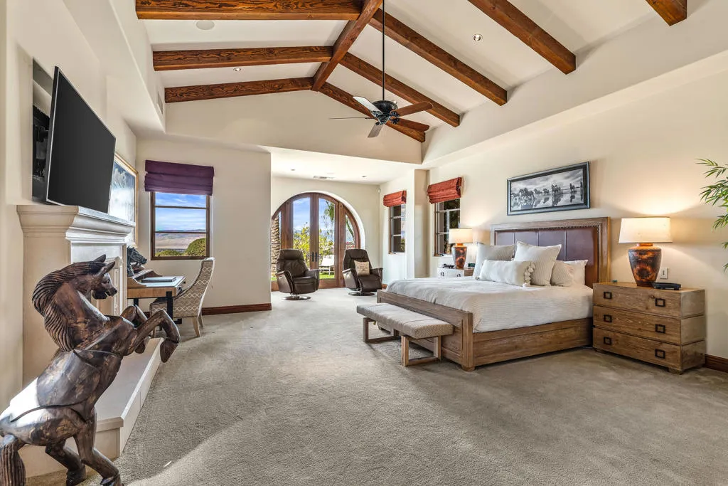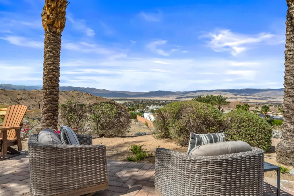 This stunning desert estate is strategically located in the prestigious development of Mirada Estates. This 5BD/5.5BA home boasts 6,033 square feet of living space, including an office, home theatre, and attached two-room guest house. Upon entering, you instantly notice the panoramic mountain and valley views through the walls of sliding glass that open the home to the inside/outside lifestyle. Arguably the best-elevated views in the desert. Custom finishes throughout. The kitchen includes a sub-zero refrigerator/freezer, Wolf oven, Dual dishwashers, a Well-appointed outdoor kitchen, and a Temp-controlled wine cellar.Great for hosting parties and entertaining. The main suite offers views of the city lights and surrounding mountains, spacious closets, dual sinks, and a large walk-in shower. The yard is perfectly appointed with a private courtyard with a fireplace and water features. A large pool overlooks the valley floor and mountain views, a fire pit, a misting system, water features, putting green, and plenty of places to bask in the sun, eat dinner, or have an intimate conversation with friends. You have the perfect location within walking distance of the Ritz Carlton, which includes multiple restaurants and entertainment. This is one of the most elegant desert rentals available.