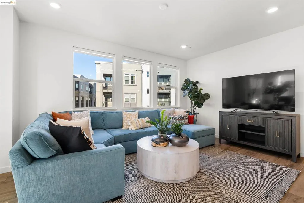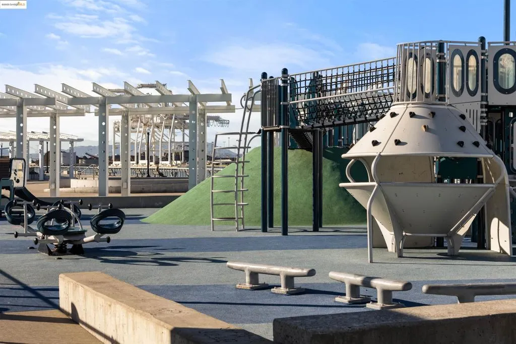 Welcome to this stunning, nearly new, contemporary corner condo in Alameda’s Bay 37 waterfront community, completed in 2023. This two-bedroom, two-bath home features a roomy, open-concept layout, perfect for modern living. The heart of the home is a shining kitchen with a central island, flowing seamlessly into the living room, which is bathed in natural light from sweeping windows. Enjoy a captivating “peek-a-boo” view of Oakland’s Inner Harbor and the distant top of City Hall while dining. For truly panoramic vistas, including the Bay Bridge and downtown San Francisco, residents can enjoy the shared rooftop deck. The home includes many modern conveniences: in-unit laundry, a dedicated garage with EV charging capabilities, and an owned solar system. Bay 37 offers residents an array of amenities, including waterfront walking paths, picnic areas, a park and playground, and a community dock. Commuting is effortless with a complimentary water taxi service to Jack London Square and a free shuttle to the 12th St. Bart Station, providing easy access to SF via ferry or Bart. Plus, neighborhood essentials like Target and Safeway, along with diverse dining options, are all within a half-mile radius!