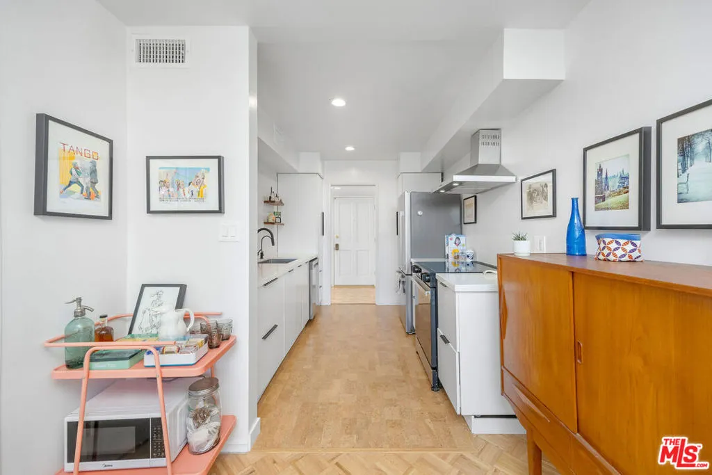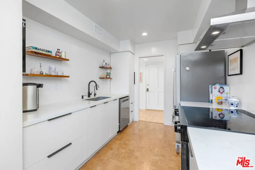 This modern, move-in-ready 1BR/1BA condo in the heart of Sherman Oaks blends chic Upper West Side character with mid-century minimalism. Wall-to-wall bookshelves are the cosmopolitan anchor for an open living area, enriched by refinished parquet floors and a private balcony view of the Sherman Oaks hills. Double French doors lead to a recently remodeled kitchen complete with quartz countertops, eco-friendly cork flooring, stainless-steel appliances, and an adjoining dining area/flex space ideal for a home office or lounge.The spacious bedroom mirrors the unit’s generous scale, offering a quiet top-floor retreat just moments from neighborhood hot spots like Casita, Taisho, BLVD Steak, Whole Foods, Ralphs, and CorePower Yoga. Thoughtful upgrades throughout include new HVAC, a newly renovated bath with Electrolux stackable W/D, designer ceiling fans, and contemporary finishes. Located in an HOA community with a classic kidney-shaped pool, the unit also includes a dedicated parking space with storage. Style, soul, and comfort meet seamlessly in this elegant Sherman Oaks flat.