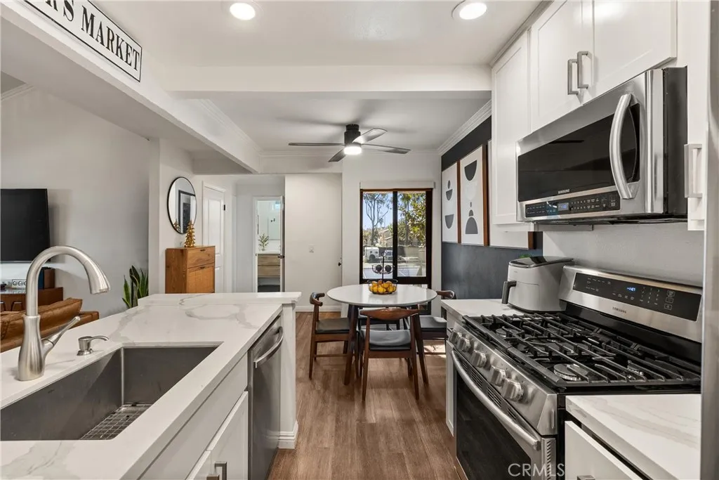 BEACH-CLOSE DESIGNER HOME IN GATED VILLA PACIFICA! Just about a mile from the sand and minutes to downtown Huntington Beach, Pacific City, Seacliff Shopping Center, and nearby parks, this beautifully updated upper-level condo offers incredible potential! Recently remodeled with designer finishes throughout, the open-concept great room features soaring ceilings, stylish new flooring, upgraded lighting and ceiling fans, and sliding doors that lead to a spacious private balcony – perfect for morning coffee or evening BBQs. The brand-new kitchen boasts sleek cabinetry, quartz counters, and stainless-steel appliances, while both bathrooms have been tastefully redone with modern fixtures and finishes. Thoughtful details include interior laundry, dual-suite style bedroom layout for privacy, and excellent storage. Gated Villa Pacifica offers resort-like amenities including a sparkling pool, spa/jacuzzi, sauna and tennis courts, plus secure parking with two assigned spaces and guest parking. Enjoy the best of coastal living in “Surf City” with easy access to the pier, beaches, restaurants, shopping, and award-winning schools – this turnkey home is ready for you to move right in and start enjoying your Perfect L3: Location, Luxury, Lifestyle!