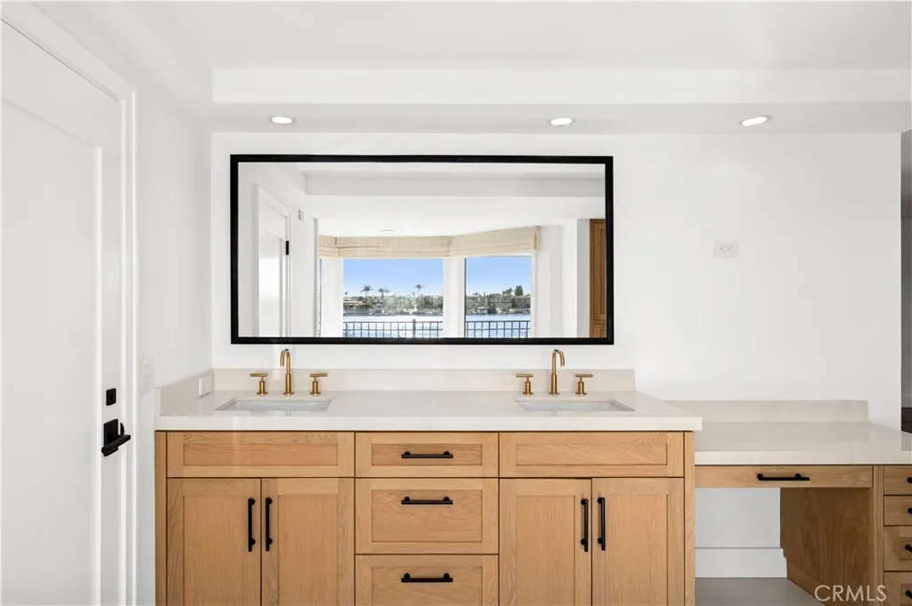 Outdoors, a generous bayside patio with brick hardscape and lawn creates an inviting setting for entertaining or simply enjoying life at the water’s edge. The main level also includes a bedroom with adjacent bath appointed with brass fixtures.