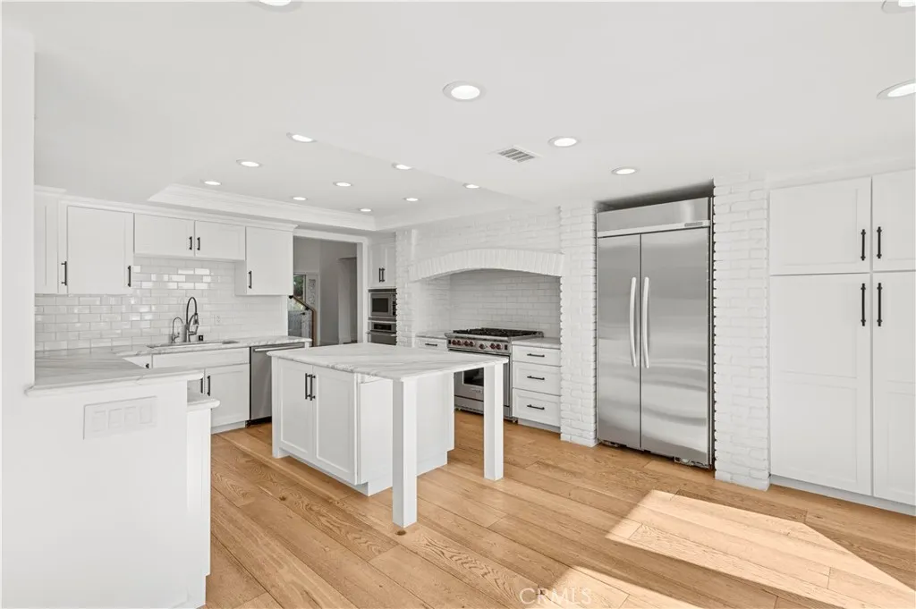The interior is defined by white oak hardwood floors throughout and a dramatic two-story foyer highlighted by a circular staircase with white oak handrail. Formal and casual living spaces flow seamlessly, including a formal dining room with vaulted, grooved ceilings and a spacious living room centered around a white brick fireplace with French doors opening directly to the bay. The updated kitchen features marble countertops, stainless steel appliances, a breakfast nook, and opens to an adjacent family room with fireplace—ideal for everyday living and entertaining.