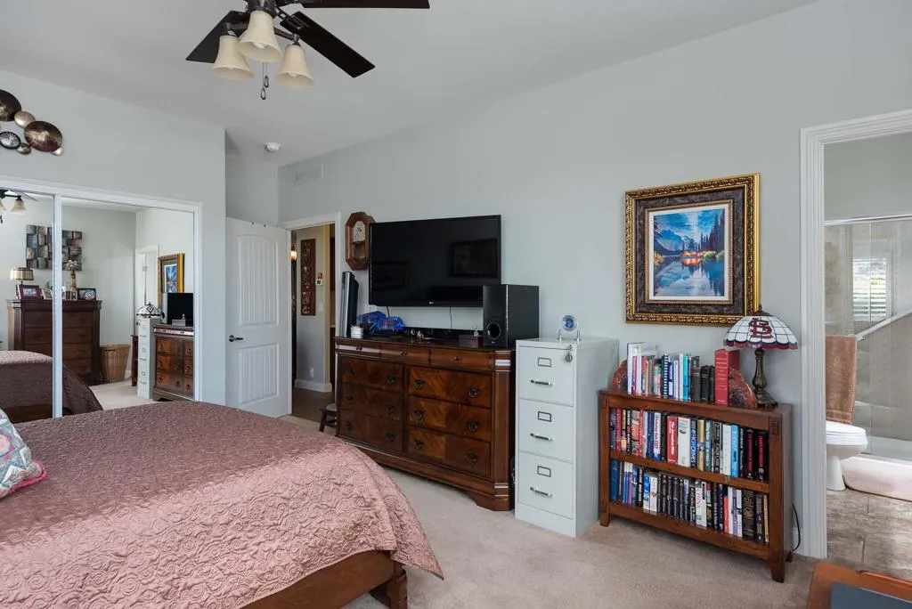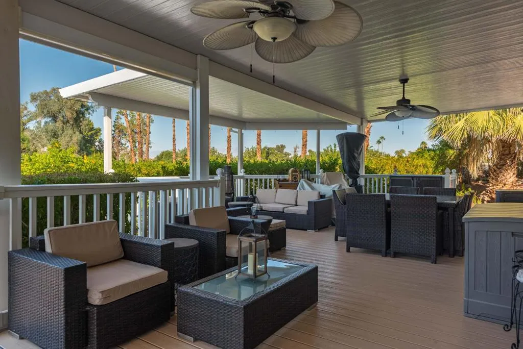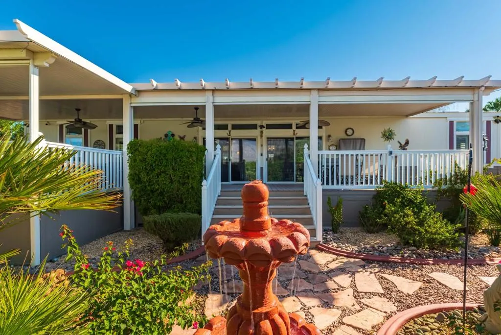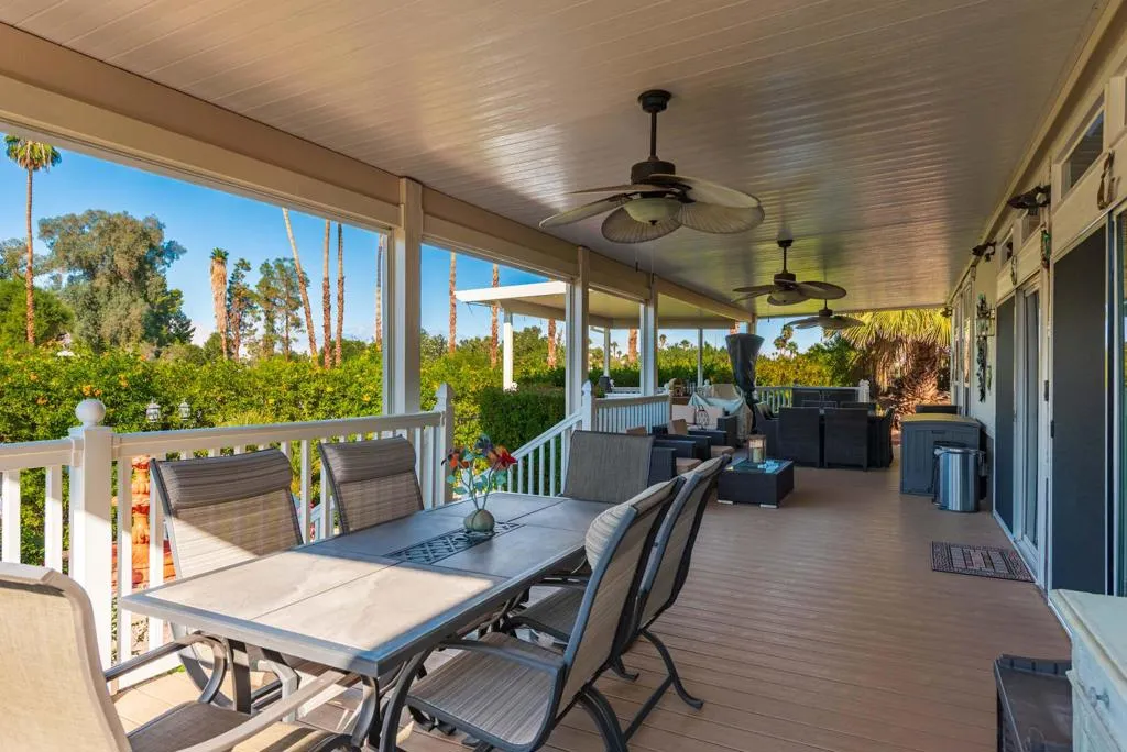 Truly One of a Kind Manufactured Home in Palm Springs! This 2012 Crestline model sits high on its lot with Fantastic Western and Southern Mtn. Views! There are stained and sealed driveway and sidewalks which leads to the Massive Front Porch, perfect for entertaining, morning coffee or an evening meal. This covered patio looks out onto the private yard with fountain and I say WOW every time I’m there. This porch has seating for 15-20 people and is a great selling feature! The porch slider leads you into the large open concept Living area to include The Living and Dining Rooms and efficient kitchen with oversized center island. There is tons of storage and cupboards throughout the kitchen and island areas. The carport entry leads to the laundry area with a full-sized raised Washer and Dryer set along with a very large pantry closet. There are two Primary Suites at either end of this unit. One Primary Suite is Light and Bright on the South side with room for a sitting area, a desk area and plenty of closet space. It’s En suite has a step in shower with single vanity and storage. There is a third bedroom with large closet and hallway half Bath. The other Primary Suite also has a desk area and a large walk in closet. This Suite includes a oversized garden tub and tiled walk in shower and vanity. The home features raised panel doors along with High End electrical blinds both on the Western side of the Exterior Porch and the Western windows in the home. There are wooden shutters throughout. The extended carport would fit 3-4 cars and there are three extra guest parking spots right across the street. There are two large storage closets with built in shelving,one at the end of the carport and the other on the backside of the house. There are three separate entrances to the under side of the home with tons of room to store yard or personal items and easy access to underside of home. I guarantee you will NOT find another property like this one. This community is close to shopping, Trader Joes, Target and local restaurants. About 10 minutes to PS Int’l Airport and easy freeway access on Gene Autry Dr. The is an active social calendar at the clubhouse, there is a pool and spa and the adjacent recently completed CV Link!! Palm Springs View Estates require an application process for income and credit. Monthly lot rent will start around $650, please make an offer Today!!