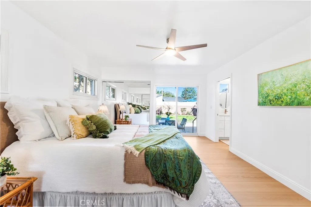 The bedroom retreat offers two closets, direct access to the backyard, and a beautifully finished bathroom just beyond. A high-set horizontal window frames leafy park views while maintaining complete privacy, creating a calm and restorative atmosphere. The second bathroom sparkles with a bright white tub and full-length shelf, a clean white vanity, oval mirror, and polished stainless details.