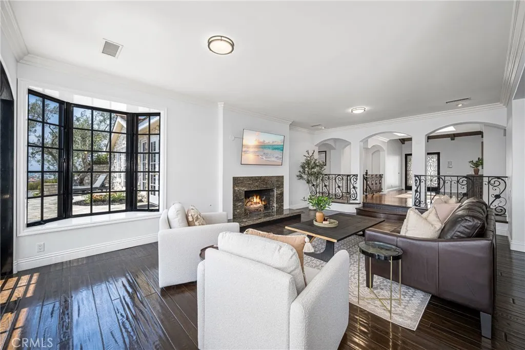 Positioned on a premier bluff-front parcel in Irvine Terrace, this fully furnished residence commands sweeping harbor, ocean, and sunset vistas; an exceptional setting where architectural scale, natural light, and coastal atmosphere converge. Expansive terraced grounds cascade toward the view, creating a series of outdoor environments tailored for refined living and effortless entertaining. A voluminous living room introduces the home with a sophisticated interplay of light and space, highlighted by a fireplace, an intimate ocean-view sitting nook, and sets of French doors that dissolve the boundary between indoors and out. The grand dining room, enhanced by a full serving bar, provides an impressive backdrop for hosting on any scale. The culinary spaces are crafted with remarkable intention: an oversized kitchen appointed with an island, breakfast bar, office nook, extensive counter surfaces, abundant custom cabinetry, premium appliances, dual convection ovens, six-burner cooktop with cast-iron griddle/grill, beamed ceilings, skylight, custom range hood, walk-in pantry, and a dedicated laundry room. The kitchen unfolds into the adjoining family room—an inviting, architecturally rich space with vaulted beamed ceilings, curated built-ins, a fireplace with mantel, and additional French doors capturing the breadth of the coastal panorama. A distinguished office/library creates an ideal retreat for study or creative work, complemented by a fireplace, bespoke built-ins, and soft daylight from a skylight. The primary suite occupies a privileged vantage point, presenting soaring beamed ceilings, a fireplace, a private retreat area, commanding coastal views, and direct outdoor access. The primary bath evokes a spa-like ambiance with a dual-sink vanity, makeup vanity, soaking tub with integrated shelving, walk-in shower, and an expansive walk-in closet fitted with custom organization. A ship-lapped lower level extends the living experience with a flexible lounge ideal for media, gaming, or relaxation. Completing the estate is an oversized three-car garage with generous storage and meticulously arranged grounds that celebrate the beauty of the bluff-top setting. A rare opportunity to experience the revered Irvine Terrace lifestyle; moments from Corona del Mar’s beaches, boutiques, dining, and acclaimed Blue Ribbon schools; framed by some of the region’s most captivating coastal views.