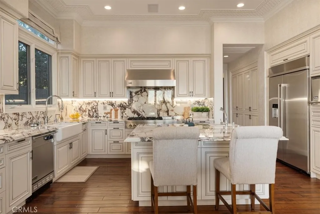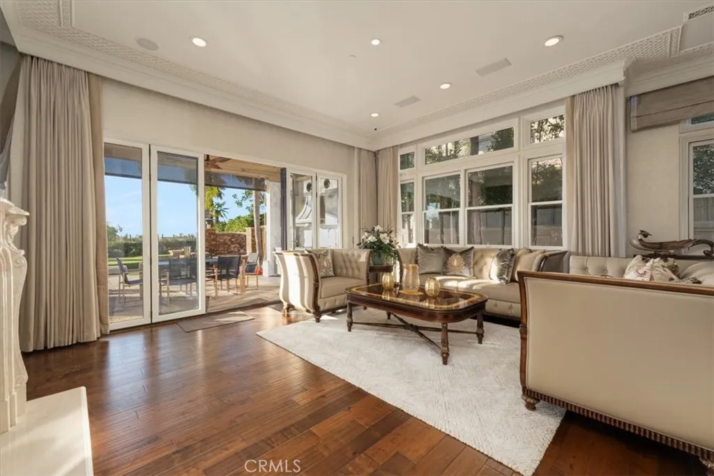 On a tranquil cul-de-sac in the exclusive, guard-gated community of Pelican Hill in Newport Coast, California, a 6,200-square-foot estate sits on a scenic quarter-acre lot. Its freshly painted exterior, towering palm trees, and manicured landscaping set the stage for this 6-bedroom, 6.5-bath Spanish-style residence. Panoramic views of the Pacific Ocean and spectacular sunsets are visible from many vantage points. Glass-inlaid double doors open to a grand foyer, where soaring ceilings, exquisite and artful design create a refined ambiance. Handcrafted Spanish natural stone fireplaces anchor key entertaining areas. The main level features formal living and dining areas that capture coastal views. An inviting family room leads to a sun-drenched breakfast nook and an exceptional chef-inspired kitchen. Equipped with premium Viking/JennAir appliances and oversized Spanish natural stone island. Downstairs provides a guest ensuite and powder room, while upstairs features four comfortable and stylish retreats, along with an office adorned with bookcases and a custom double-sided desk that can easily be converted back into a fifth bedroom. The primary suite featuring a personal sitting area with a fireplace, an ocean-view terrace, Spanish natural marble double vanities, a bathing tub, shower, and a smart toilet. Carefully selected high-end curtains and wallpaper imported from England, as well as luxurious carpets. The junior suite shares the same design philosophy, but with different decorations. Its ensuite also features a double vanity, a brand-new tub and shower. From its British-sourced wallpaper and high-end curtains to the color and pattern of the carpet, all are meticulously arranged. A generous walk-in closet and an integrated dressing room complete this exquisite retreat. Two additional rooms, each with a different design style, provide comfortable space for relaxation. In the backyard, resort-style amenities await, a swimming pool and spa, a California room with an outdoor kitchen including a gas stove and a sink meticulously designed for outdoor entertaining. Highlights include a high-end chandelier, smart sliding mortise locks, pop-up sockets, recessed lighting with dimmers, and a separate laundry room, customized curtains, wallpaper, moldings, and wall panels throughout the home. Attached 4-car garage completes its practical appeal. Discover the pinnacle of coastal living, where every detail is meticulously crafted for those with discerning taste!