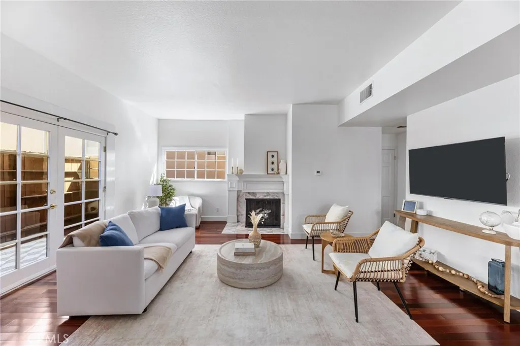 Quietly situated as a rear-unit townhome, 1515 Artesia Blvd Unit #2 is a charming retreat. Upon entry, the home is bathed in natural light and features hardwood floors throughout. The living room includes a fireplace and French doors that open to a private outdoor patio, creating indoor-outdoor flow. Just two steps up, the dining area features a second set of French doors leading to a private terrace and connecting to the adjacent kitchen, which offers ample storage and breakfast bar seating. A powder room and direct access to the two-car garage complete the main level. Upstairs, both bedrooms feature en-suite bathrooms. The primary suite offers vaulted ceilings, a private outdoor terrace, generous natural light, a large walk-in closet, and an en-suite bathroom with a glass-enclosed shower. The secondary bedroom features high ceilings, an en-suite bathroom, and ample storage. An upstairs laundry room with built-in storage and a skylight providing additional natural light completes the upper level. With easy access to downtown Manhattan Beach shops and dining, as well as LAX and major freeways just minutes away, 1515 Artesia Blvd Unit #2 presents convenience, charm, and everyday livability.