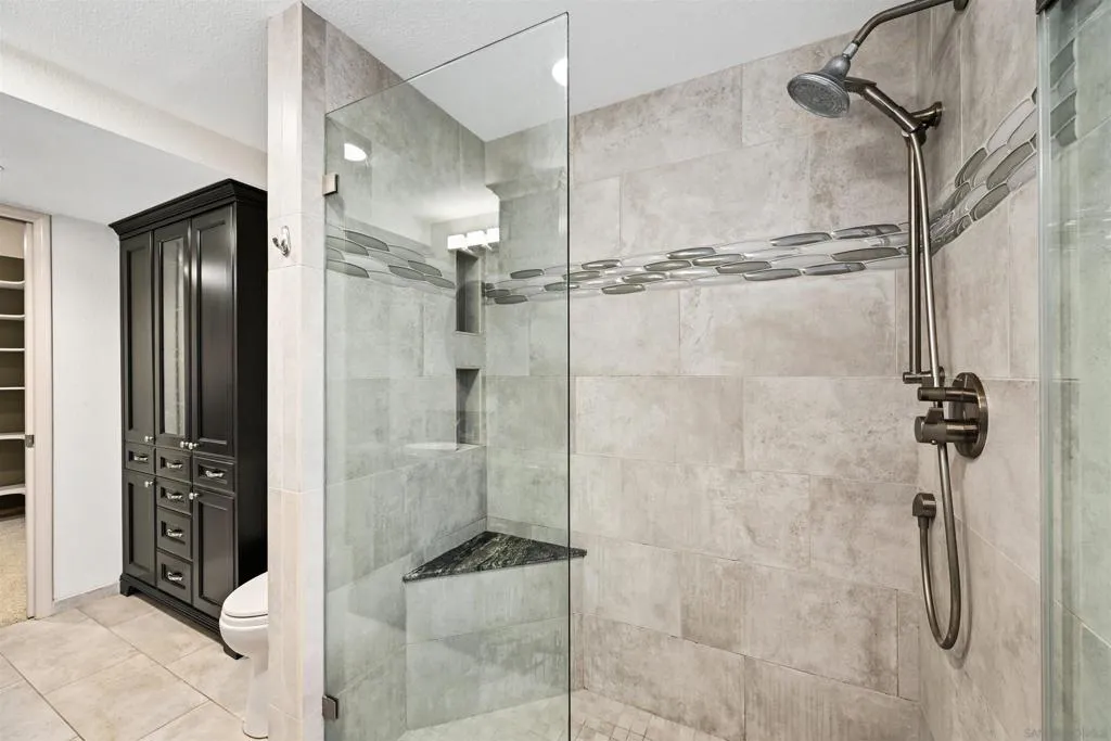Set on a rare .39-acre golf-course lot in San Diego, this custom residence offers sweeping fairway views from every room. Thoughtfully designed for indoor-outdoor living, highlights include sliding glass doors in every bedroom, a dramatic spiral staircase with skylight, a large second-story deck, veranda, and custom stone patios. The home features travertine tile in the kitchen, family room, and hallways, vinyl plank flooring (2021), and beautifully remodeled kitchen and baths. All rooms are hard-wired for Ethernet with a dedicated lower-level access point. Energy-efficient upgrades include owned solar (2020) with no electric bill, a new solar battery and inverter (2025, under warranty), and a 2023 heat pump and AC system. Approved, paid-for permits and architect plans are in place to convert additional living and dining rooms into a studio ADU with its own address (9221). Outdoor amenities include mature gardens, fruit trees, water-efficient landscaping, stamped concrete, gazebo, shed, and multiple covered entertaining areas. A rare opportunity combining views, efficiency, and future flexibility—right on the golf course.