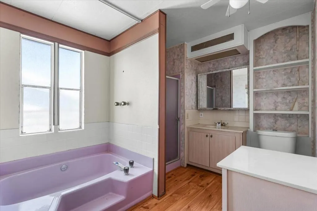 Discover this HUD-Owned residence within the sought-after Palm Desert Greens Country Club– a space where classic comfort meets potential for customization. This well-designed 2-bedroom, 2-bath home offers a layout that invites both relaxation and sociability. The spacious living area features a cozy gas fireplace, creating a warm focal point, while a built-in display hutch enhances the adjacent dining area.The kitchen, with its inviting circular dining nook, opens to an expansive family room. Easy-care laminate flooring links these spaces, ensuring both practicality and style. Energy-efficient plantation shutters and ceiling fans throughout provide comfort and ambiance year-round.Outdoors, unwind in your private hot tub under a large gazebo, where tranquility meets luxury. The community itself is an oasis of leisure, included in your HOA fees are complimentary golf, cable TV, lighted tennis courts, two resplendent pools, serene spas, a state-of-the-art fitness center, and clubhouse.Conveniently located near shopping and fine dining, this home balances accessibility with the peacefulness of its surroundings. While this residence is in fair condition, it offers a fantastic opportunity for personalization, making it a canvas for creating the ultimate desert sanctuary.