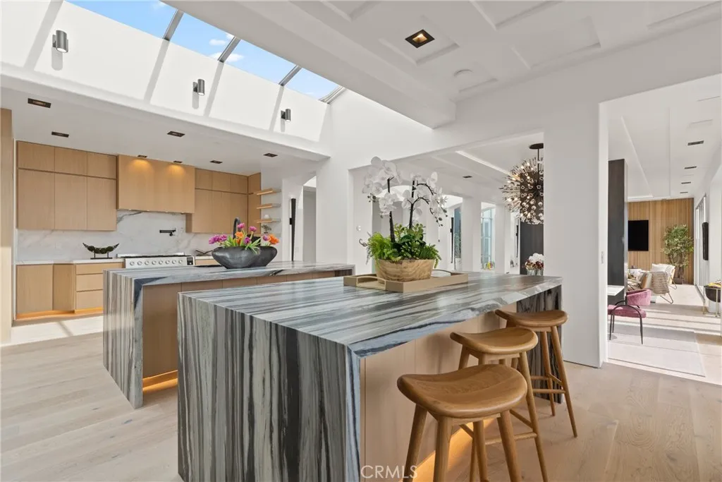 The open-concept floor plan seamlessly connects the indoor and outdoor spaces, inviting an abundance of natural light and refreshing sea breezes. The gourmet kitchen is a chef’s dream, featuring high-end appliances, custom cabinetry, and 2 large center islands, perfect for entertaining guests.