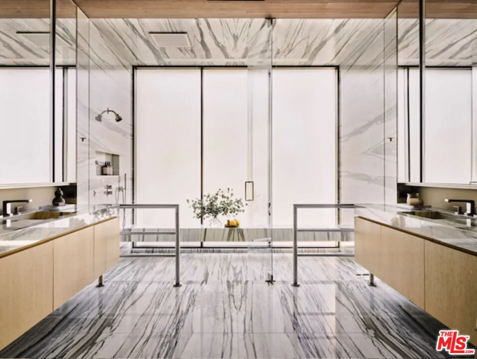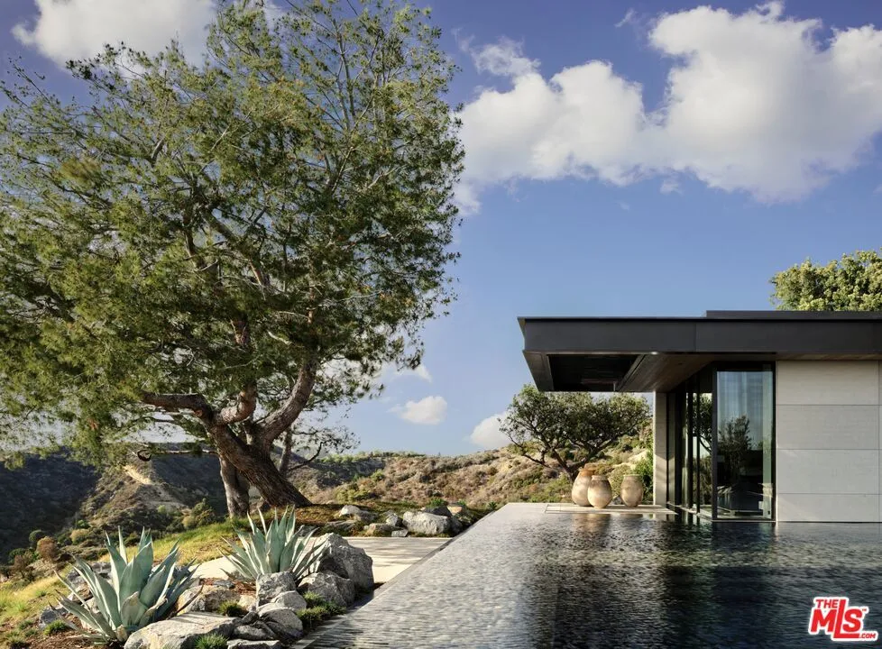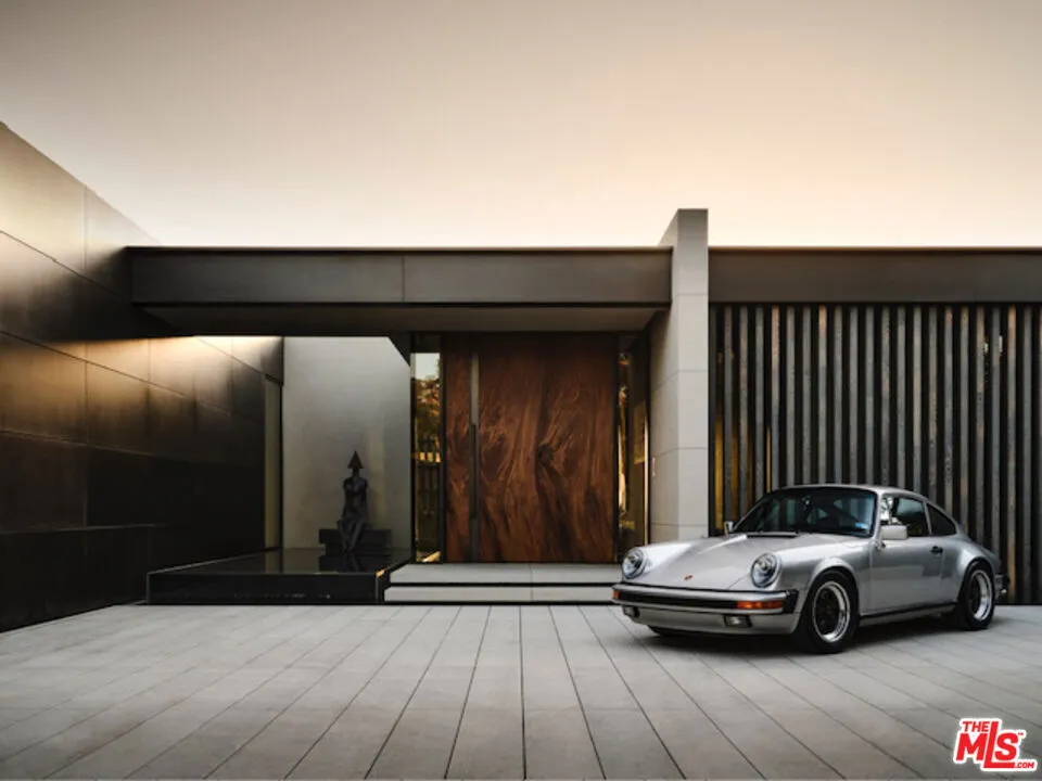 Set within a premier enclave of Trousdale Estates, this 6,500-square-foot architectural masterpiece merges contemporary luxury with the distinctive character of midcentury-modern design. Surrounded by panoramic views of the Santa Monica Mountains, this two-bedroom, four-bathroom estate offers an unparalleled living experience in one of Beverly Hills most coveted neighborhoods. In collaboration with Lucas Design Studio, the residence embodies soft contemporary architectural precision and material mastery, featuring an array of exotic finishes selected for their beauty and integrity, along with four sculptural gas fireplaces that bring warmth and architectural presence to the home. Floor-to-ceiling windows invite natural light and stunning vistas into every room, creating a harmonious flow between indoor and outdoor living. A striking flame-sprayed nickel wall extends from the exterior into the living room, setting the stage for a curated collection of design icons, including a curved Vladimir Kagan sofa, an Ado Chale coffee table, and a Paul Evans I Wavy front credenza, all resting atop a custom wool and silk rug from Fedora Design. Art takes center stage in this residence, with commissioned works throughout, including a mesmerizing light sculpture by LA artist David Wiseman that illuminates the sunken TV lounge. Inspired by the surrounding landscape, Wiseman cast acorns from the property’s trees, incorporating them into the intricate design. At night, the sculpture transforms the space into an enchanting retreat, evoking the feeling of relaxing beneath a starlit canopy. The dining room exudes sophistication, with a Herve Van der Straeten dining table, complemented with dining chairs by designer Hans Wegner. The open-concept kitchen is equally striking, featuring wire-brushed and cerused rift oak cabinetry, quartzite countertops, and dazzling custom lighting. The primary suite is a unique sanctuary, with a custom-upholstered bed, luxurious textiles from de Le Cuona, and designer pieces by Roger Capron and Paul Evans. The vast spa-inspired primary bath is a study in exquisite stonework with two Toto toilets enhancing the spa-level experience. Midcentury Swedish flatweave rug, and vintage sconces elevate the guest suite’s atmosphere of curated luxury. Floors are Terrazzo, bantered by bordered by limestone edges. Outside, the infinity pool extends to the edge of the living room, creating a seamless visual connection between water and sky. Thoughtfully designed outdoor spaces offer ample room for relaxation and entertaining, with breathtaking views serving as the perfect backdrop. A rare offering in a historic enclave once home to legends like Frank Sinatra and Elvis Presley, this residence is a masterclass in design, blending artistry, luxury, and architectural integrity. This estate is being offered furnished as curated for someone desiring a highly designed atmosphere throughout. Particular attention was paid to the lighting design for the home, pool, and landscaping, to the point where the homeowners insist that interested Buyers experience the property both during the day and in the evening to fully appreciate it. Highlights include Italian iGuzzini laser lighting integrated throughout the home. The residence is prominently featured on the sites of its creative partners – Lucas Studio (lucasinterior.com), TLD Lighting Design (t-ld.com), and Hocker Design Group (hockerdesign.com) offering an additional lens into the home’s exceptional design.