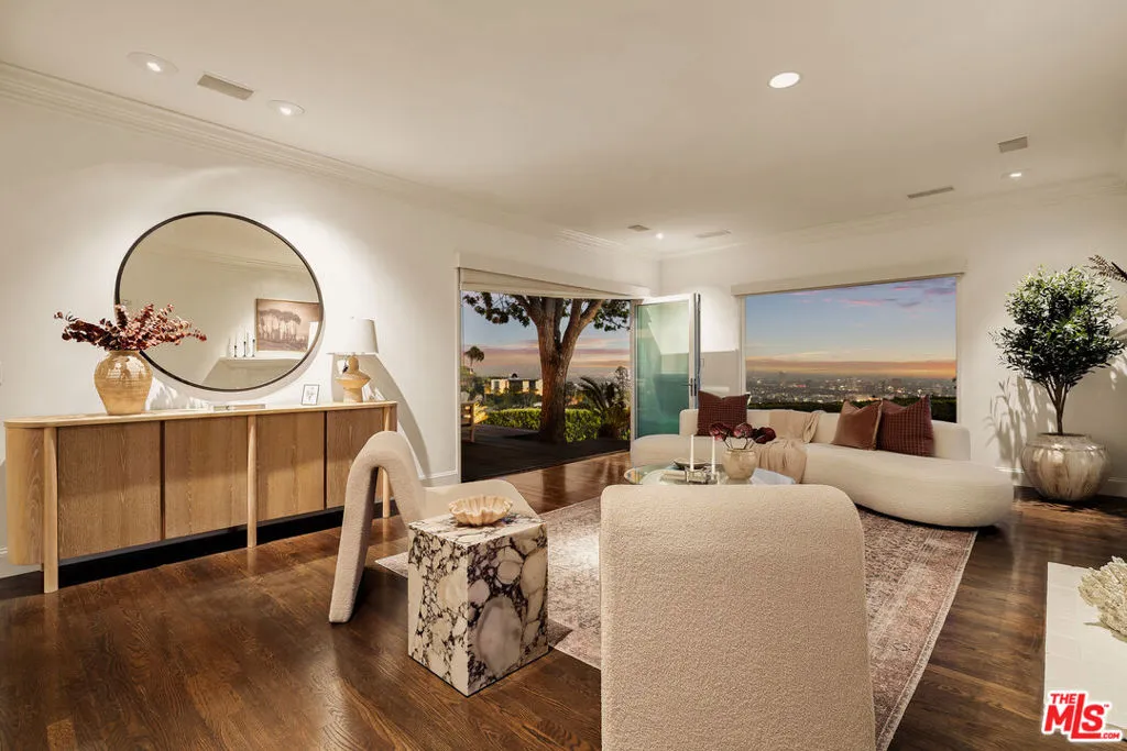 Experience elevated Los Angeles living in the sought-after Bird Streets at 9279 Sierra Mar Drive. Set behind gates for ultimate privacy, this designer-done residence showcases panoramic views stretching across the LA skyline and, on a clear day, all the way to the ocean. Floor-to-ceiling glass doors in the living room, dining room, and primary suite fully retract, creating a seamless indoor outdoor flow and framing breathtaking vistas from sunrise to sunset. The living room is anchored by a stunning fireplace, while a beautifully appointed wet bar and entertainment counter further enhance the home’s hosting experience.Inside, the chef’s kitchen features marble finishes and custom cabinetry, paired with luxuriously updated bathrooms designed with the same elevated attention to detail. The primary suite includes custom-built closets for effortless organization. Additional amenities include a two-car garage, and secure, gated entry. A sparkling pool and generous terrace overlook the city below, offering the perfect setting to relax or entertain with ease. A rare blend of privacy, luxury, and iconic Bird Streets views this is Sierra Mar at its finest.