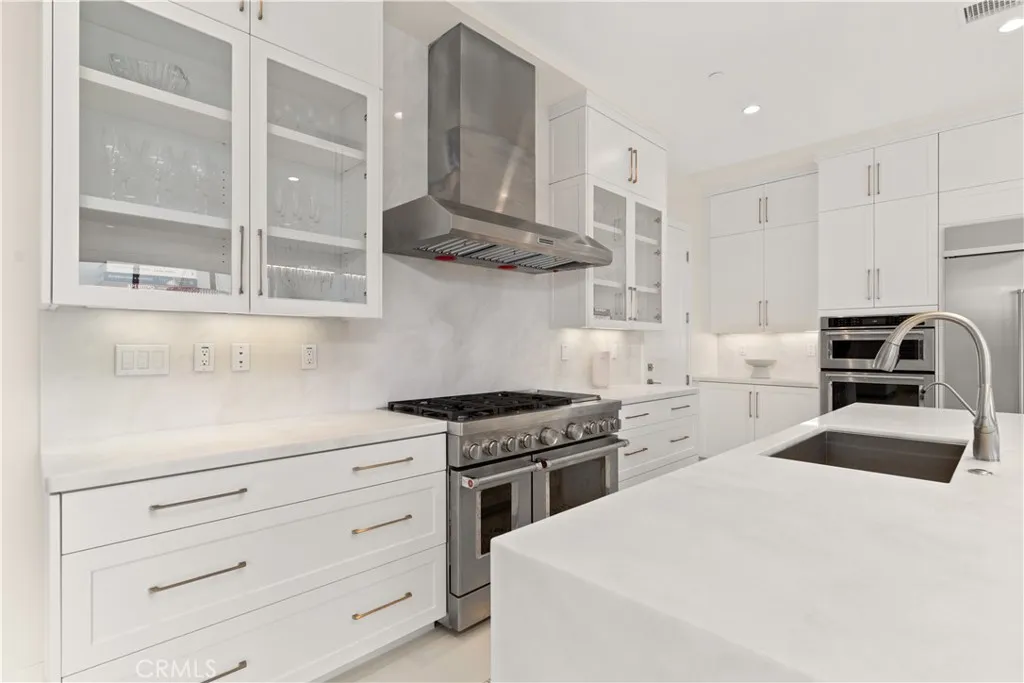 The gourmet chef’s kitchen is elegantly appointed with a large center island and wraparound bar seating, upgraded KitchenAid stainless steel appliances, a built-in refrigerator, and a secondary private pantry.