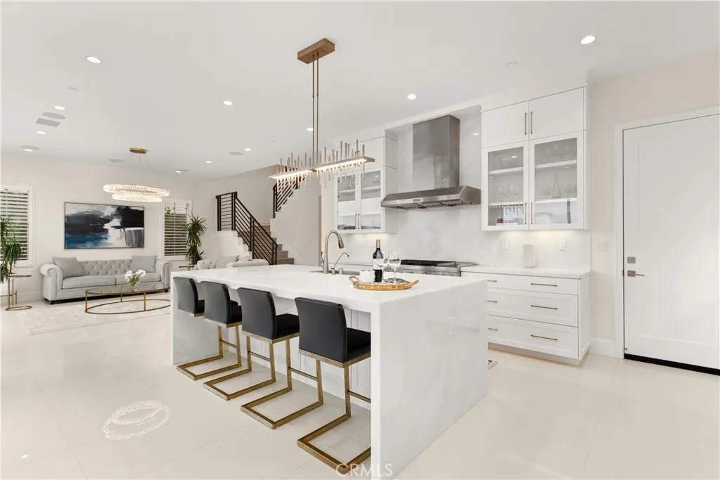The expansive great room flows effortlessly into the dining area and opens through dramatic panoramic sliding glass doors to a dream backyard. Enjoy outdoor living at its finest with a custom fire pit, sitting area and built-in BBQ, all set against breathtaking views of water and rolling hills—perfect for relaxing or hosting unforgettable gatherings.