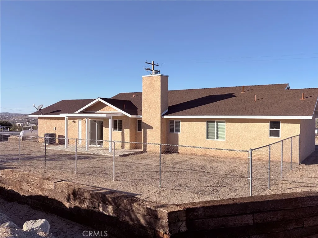 Desert Charm Meets Modern Comfort! Just minutes from the iconic Joshua Tree National Park and marine base, this turnkey corner-lot gem offers everything needed to embrace the desert in style. Enjoy panoramic views from the front yard and step inside to a freshly painted interior with brand-new carpet throughout giving the interior a crisp, new feel. The kitchen with lots of natural light features classic tile counters and floors, new appliances, and a convenient separate laundry area right within the space. Relax in the family room or living room with its own fireplace. The large primary bedroom offers two closets and a well-appointed bathroom with dual sinks and tiled counters. All rooms are equipped with ceiling fans. The exterior has newly painted fascia and a large backyard that extends beyond the chain link fencing. FA heat and air and a concrete driveway add to the comfort and value of this well-maintained home.