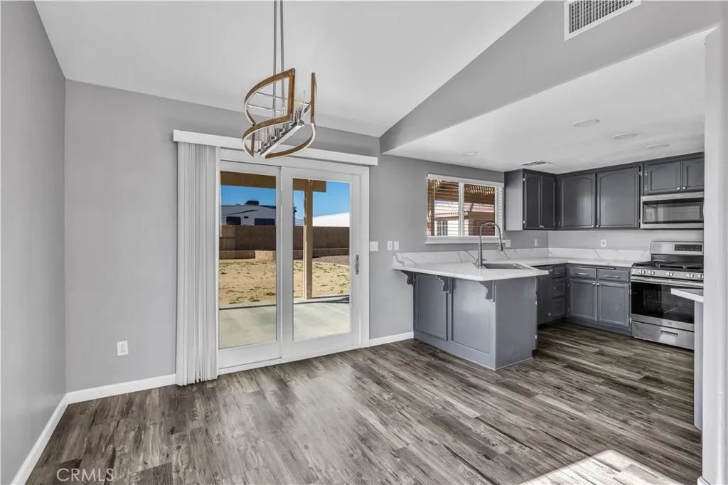 Beautifully Remodeled 3 Bedroom, 2 Bath Home PLUS AN OFFICE on a Landscaped Corner Lot in a Great Neighborhood! This spacious and stylish home offers an incredible combination of curb appeal, modern updates, and functionality—located on a quiet cul-de-sac in one of Yucca Valley’s most desirable neighborhoods. Situated on a fully landscaped corner lot, the property features a large front yard, drive-thru side gates for RV or toy parking, and a block wall-enclosed backyard for privacy. As you enter, you’ll love the open concept layout, tall vaulted ceilings, and luxury vinyl plank flooring throughout. A natural gas fireplace adds warmth and charm to the main living space, which flows effortlessly into the updated kitchen featuring quartz countertops, stainless steel appliances, ample cabinetry, generous counter space, and a pantry for added storage. This home includes three well-sized bedrooms PLUS AN OFFICE, which can easily serve as a fourth bedroom if needed. The primary suite offers two closets, a remodeled ensuite bathroom with dual sinks, a newer vanity, and a beautiful walk-in tiled shower. The guest bathroom is conveniently located near the other two bedrooms and has also been updated with a shower-tub combo and newer finishes. Additional highlights include an indoor laundry room with extra storage, a fully finished two-car garage, and modern, move-in-ready finishes throughout. Step into the backyard oasis to enjoy the large covered patio, western-facing sunsets, and flat, usable space—perfect for entertaining or relaxing. A fully finished stucco outbuilding in the rear offers even more storage or potential use as a workshop, gym, or creative space. This home is ideally located close to schools, shopping, and all the conveniences of Yucca Valley, yet tucked away in a quiet and established neighborhood. Homes with this layout, updates, and flexible space are rare—schedule your showing today before it’s gone!
