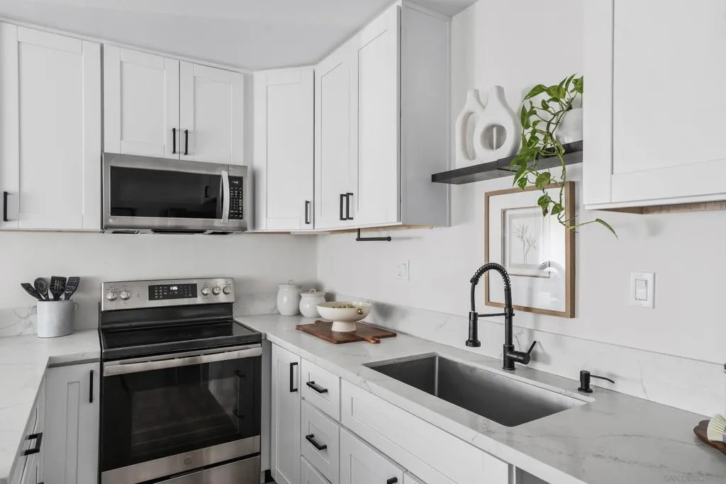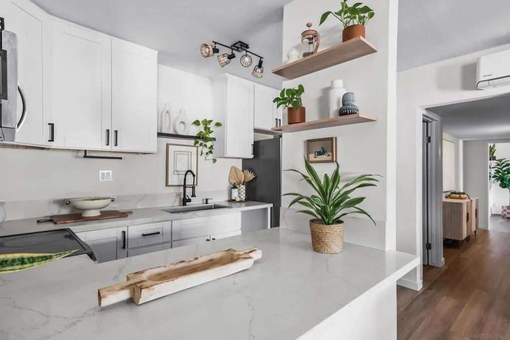 This beautifully updated top-floor residence offers convenient elevator access and sweeping hill views that glow at sunset and shimmer at night. Modern improvements include updated electrical wiring and GFCI protection, durable LVP flooring, quartz countertops, refreshed fixtures, and brand-new heating and cooling systems. Excellent storage is offered through an exclusive mini-storage unit just outside the front door and spacious interior closets. Everyday routines are made easier with convenient laundry access. Comfort and energy efficiency are maximized with the new mini-split system, providing individualized heating and cooling for each room. The community offers a pool, hot tub, basketball court, and a reservable rec room. Perfectly positioned near the freeway, SDSU, and just a 5-minute walk to the UCSD Health Trolley Station, this home is an excellent place to settle into now, and a strong rental or investment opportunity for the future.