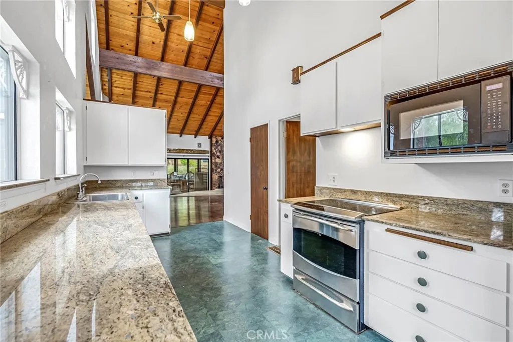 Enter into the grand living room featuring vaulted ceilings, abundant natural light, hardwood flooring, a cozy fireplace, a formal dining area, and access to the covered front patio. The kitchen offers granite countertops, newer appliances, a pantry, and deck access with views of the surrounding trees and landscape.