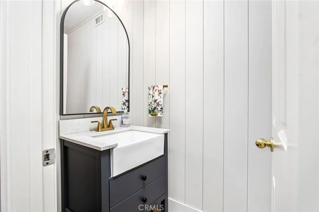 Upstairs offers a remodeled secondary bath and a refreshed primary suite with an updated marble vanity, new faucets, modern mirrors, and upgraded lighting, creating a bright, spa-inspired retreat.