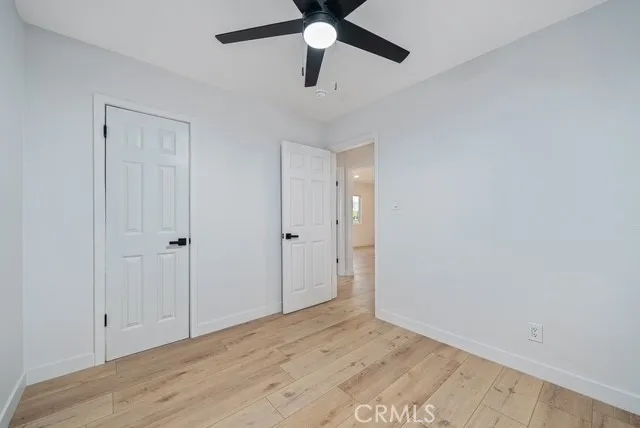 Both bathrooms have been tastefully renovated, with the en-suite showcasing elegant warm-toned tile and luxurious gold plumbing fixtures. Modern design elements are found throughout, including sleek black hardware and stylish ceiling fans, blending contemporary style with inviting warmth.