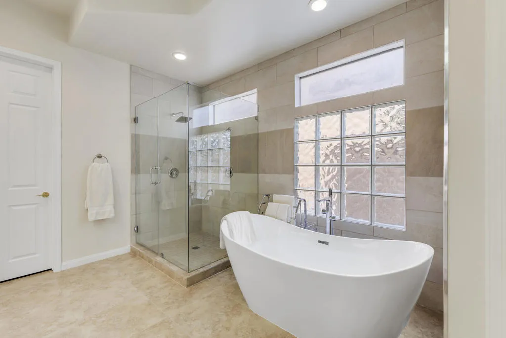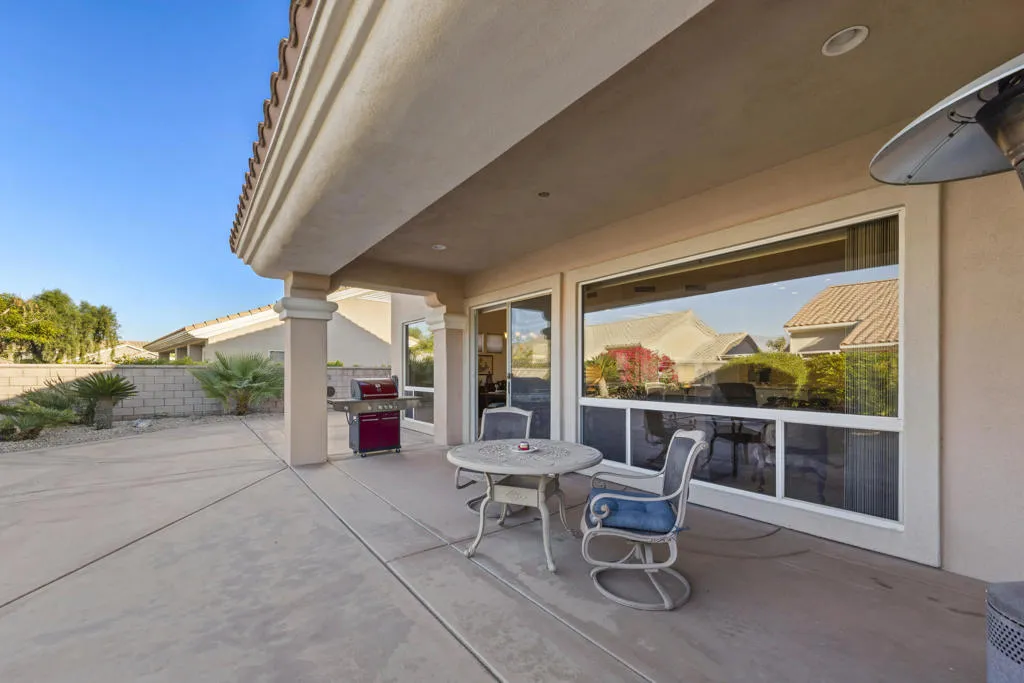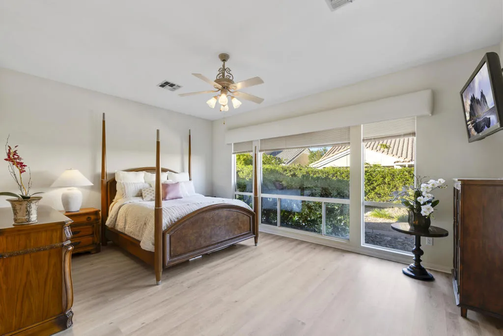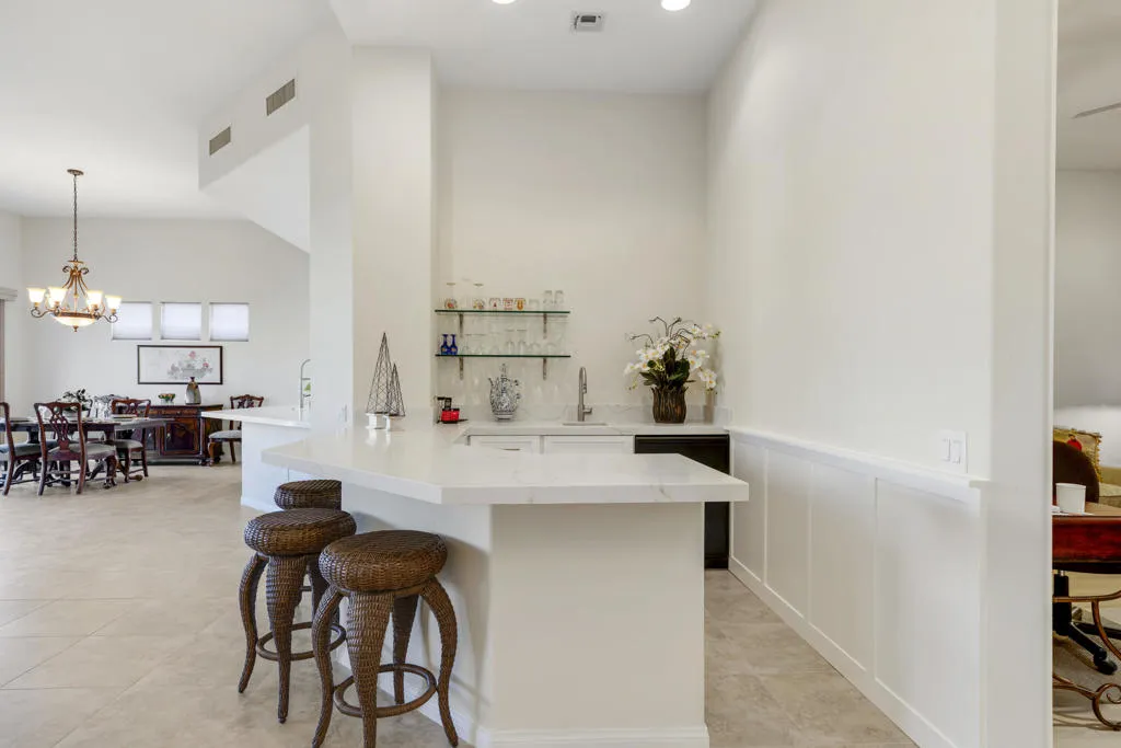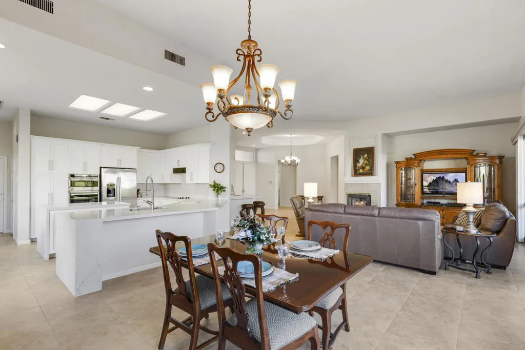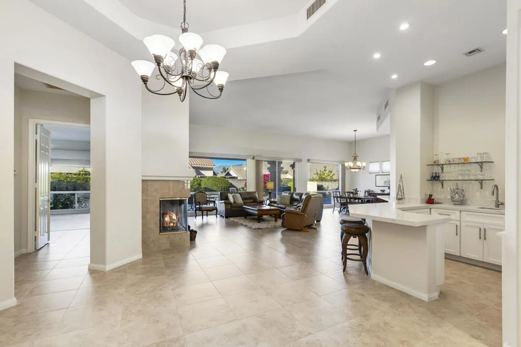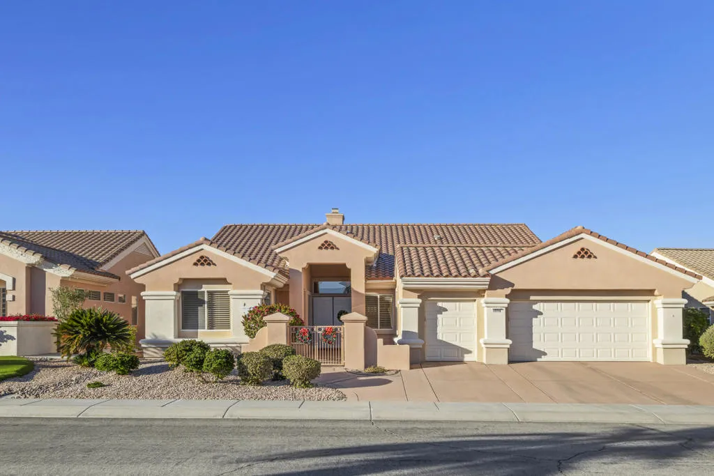 Sun City Palm Desert – THE ONE AND ONLY ST TROPEZ available right now and this one is ABSOLUTE PERFECTION! Newly remodeled from TOP to BOTTOM you will love entering into this SPECTACULAR GREAT ROOM floor plan with 12 foot ceilings! The St Tropez is famous for its HUGE great room design accompanied by a welcoming bar area for your guests to relax! !I It also includes a builtin beverage refrigerator and lovely upgraded sink and hardware, The choices of materials in this TRANSFORMATION are very tasteful with a huge TOUCH. OF CLASS! The beautiful Quartz countertops are a special feature in the kitchen, the bar area, two of the bathrooms and even the LAUNDRY ROOM area! Beautiful flooring throughout with newly installed 20′ tile is tastefully installed on the diagonal in the open areas with neutral luxury vinyl in the den and bedrooms. The kitchen is unbelievable with gorgeous white shaker custom cabinetry with beautiful chrome handles, luscious quartz countertops, deep pull out pantry shelves, a deep stainless sink with a quality faucet that is absolutely striking! PLUS ALL NEW STAINLESS APPLIANCES! Walls of glass in the great room overlook the huge extended patio which is very private and includes mature landscaping. The TV wall In the great room can be totally open with plenty of space for your 85′ big screen TV! The primary bedroom is very large with access to the rear patio by a shuttered door. The redesigned bath is outstanding with 2′ x 1′ tiles in 2 tones , and inviting rainhead fixture and extra handheld with a high quality rimless shower enclosure. Adjacent to the shower is a sumptuous deep soaking tub to enjoyi! There is also a huge closet available.In addition there are dual custom sinks along with upgraded hardware surrounded by that beautiful quartz! The secondary bedroom has beautiful high quality vinyl flooring with beautiful shutters on the windows. The bathroom has the same quartz with custom sink and new hardware. The walk in shower is totally remodeled again with 2’x1′ tiles.a rainheadShower head and a fabulous shower enclosure. The den is very large adjacent to the great room near the front entry. The laundry room is humongous! Washer dryer, deep sink,Quartz counters and lots of cabinets for storage, The 2 car plus golf cart garage is EXTENDED! ALSO INCLUDES a cabinet with a WATER SOFTENER (OWNED NOT LEASED)The extended patio is HUGE with lots of mature plants as a backdrop to your private area!