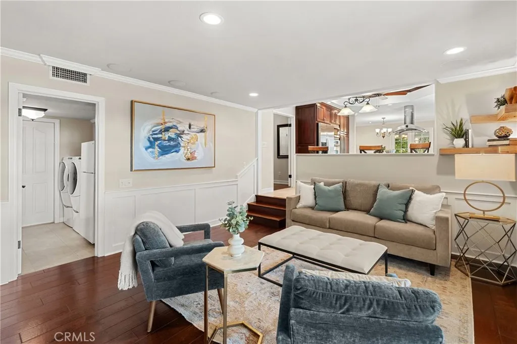 Gorgeous corner lot home is located in the desirable area of Brea; Striking curb appeal; Enjoy relaxing on the front porch which wraps the front to the side of this home taking in the beautiful Gardenlike view with Custom landscape & hardscape; Custom double door entry leads to the breathtaking remodeled floorpan; Main living room has French Doors leading to the front porch and the dining room with French Doors leads to the side porch; Open the French Doors to allow lots of natural air flow through this home; Wood floors throughout the bottom level and tile in the kitchen floors; Kitchen features granite counter tops on the main counters, center island and breakfast bar area overlooks the cozy Family Room with built-in cabinets and fireplace;Kitchen has 5-burner stove top with custom range hood, double ovens, built-in microwave, dishwasher and Refrigerator;Lots of elegant cabinets, pantry space and under cabinet lighting that compliments the open floorpan; Laundry Room with cabinets, storage closet and extra refrigerator; Main floor bathroom remodeled with access to the beautiful backyard can be used as spa bathroom as well; Custom carpet on stairs and 2 bedrooms upstairs; Primary Bedroom with wood flooring, walk-in closet, recessed lighting, crown moulding and extra wall AC leads to primary bathroom with double sinks, custom cabinets & mirrors and custom gorgeous smoky glass shower door with tiled shower; Hall Bathroom with tile flooring, granite countertop, custom cabinet, recessed lighting and privacy door has custom tub/shower & toilet area; 3 additional spacious bedrooms; All bedrooms upstairs have fans; Backyard is an entertainer’s dream with roof covering the area that includes a custom full gas fireplace, grill with overhead vent/fan on an island, built-in spa that includes a waterfall and river effect that flows into it; Relax under the Gazebo with the fan and sounds of flowing water; Backyard includes a grassy area for pets or relaxing; Added benefit is the separate covered full RV garage that is on a lower level and the street access allows for easy removal of toys, RV or additional vehicles; 3 Car garage has checkerboard flooring, custom sink; lots of cabinetry and a work bench! This home is a beauty!! JUST SHOW & SELL!!!