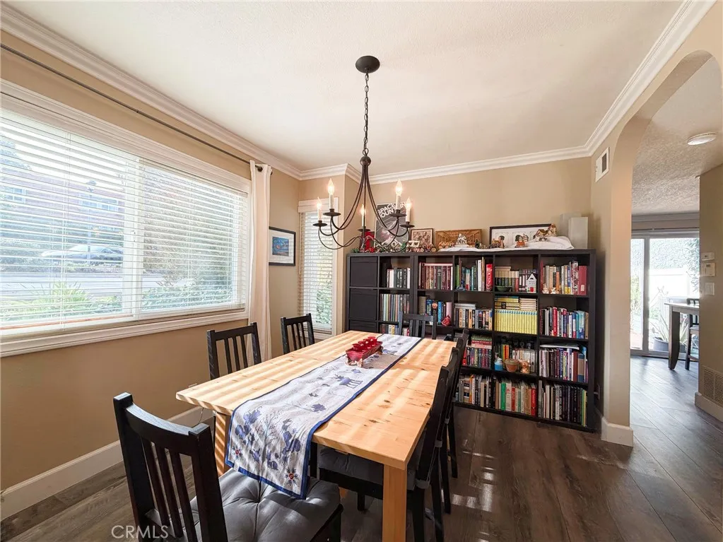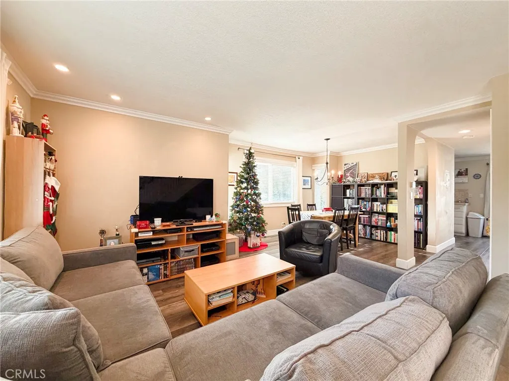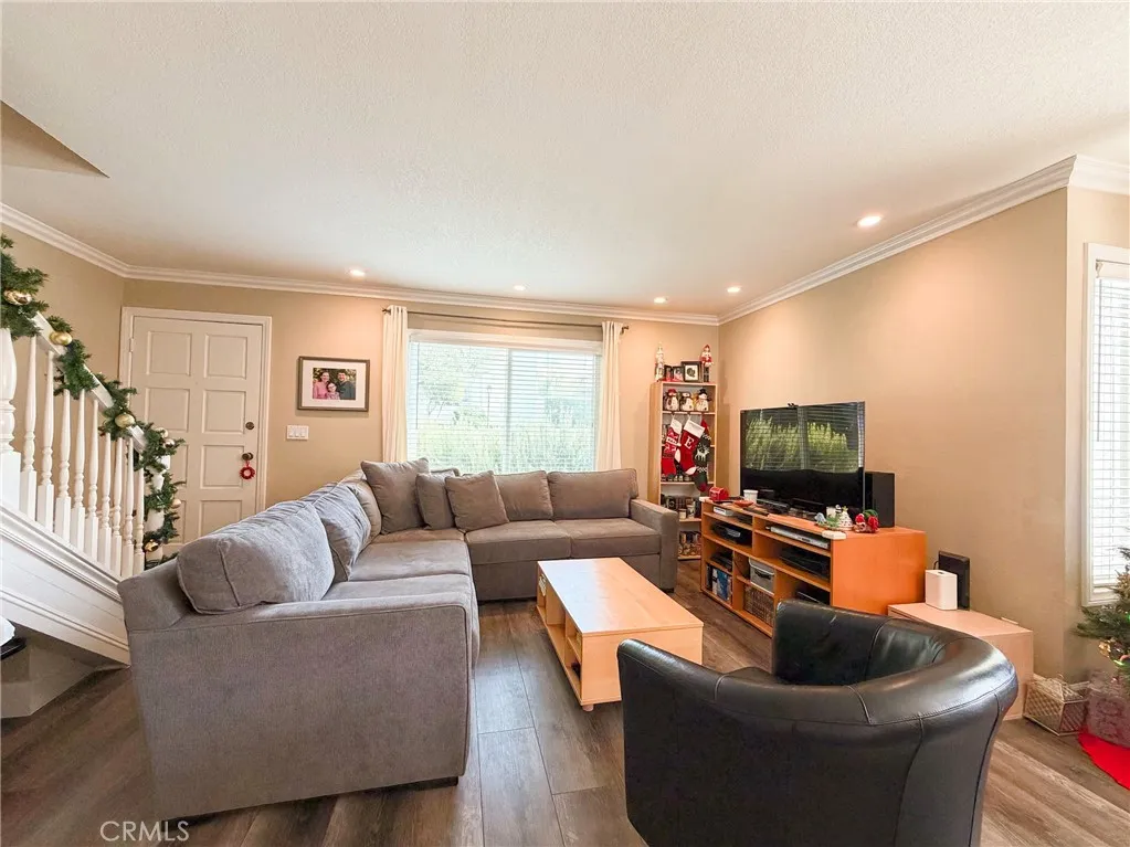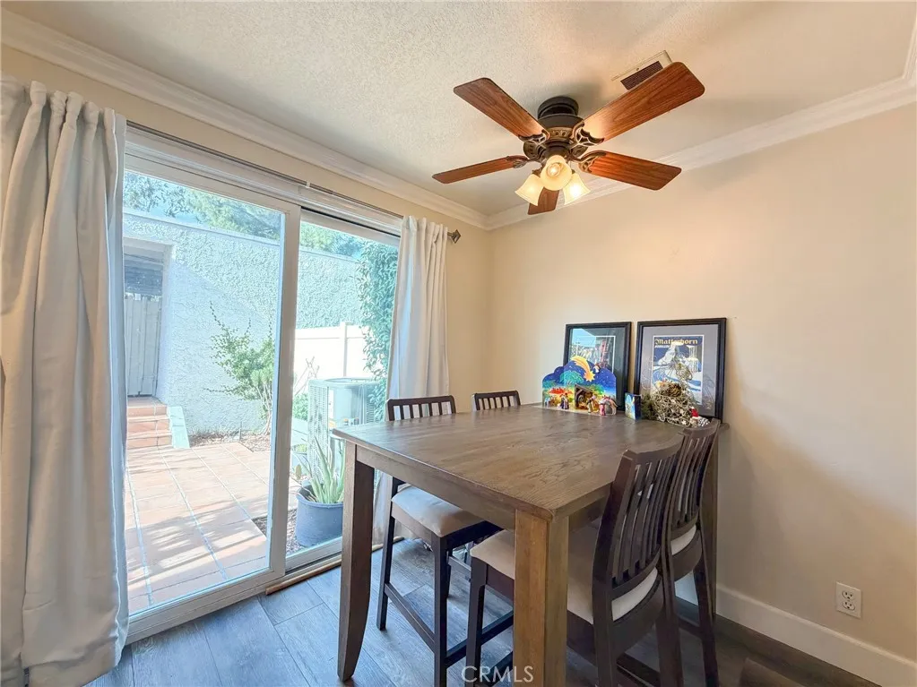 The home features a newer HVAC system, dual-pane windows, crown molding, updated flooring, inside laundry, and a nicely appointed kitchen with stainless steel appliances. An enclosed private patio provides a comfortable outdoor space for relaxing or entertaining. Parking is well accommodated with a detached one-car garage, an additional covered carport space conveniently located behind the unit, and a private storage closet within the carport.