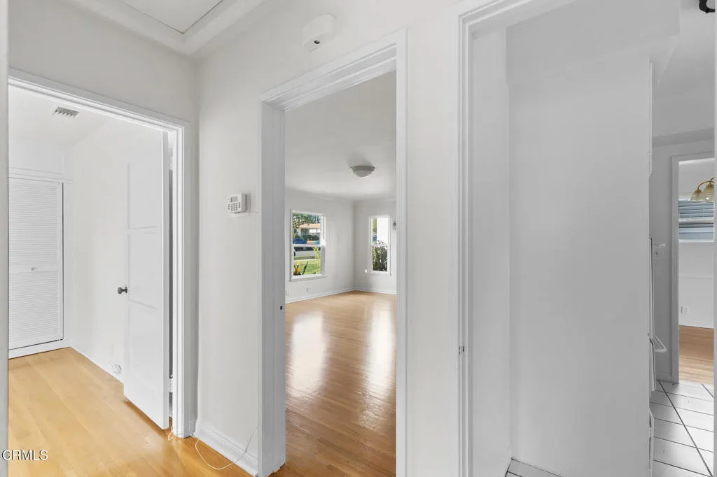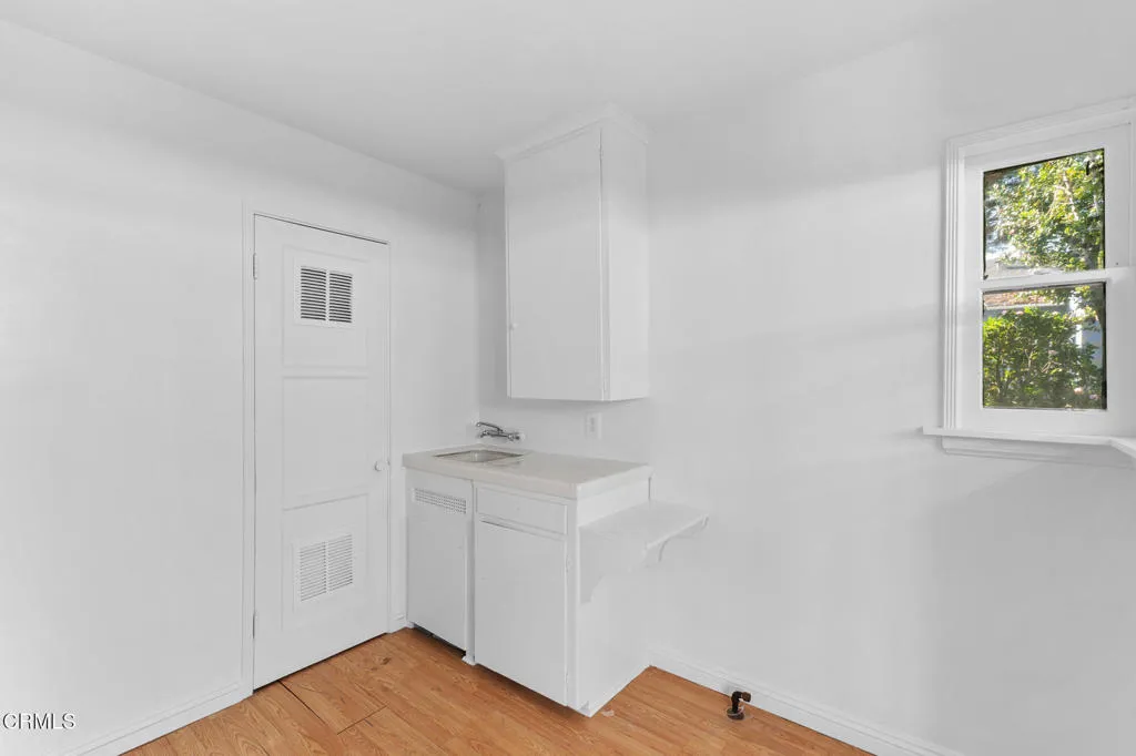 Main house with detached studio (appx. 368 sq ft) and a detached two-car garage, all set on a 7,613 sq ft lot.The 2-bedroom, 2-bath main home features fresh interior and exterior paint, newly painted driveway, and new hardwood flooring throughout. Upon entry, you’re welcomed into a bright living room that flows into a formal dining room. The kitchen opens to a comfortable gathering room with glass doors leading directly to the backyard, creating an easy indoor-outdoor connection. Laundry is conveniently located in the kitchen. The primary bedroom includes its own bathroom.A detached studio with a bathroom offers excellent flexibility, ideal for guests, a home office, or creative space. The long driveway, secured by an iron gate, leads to a spacious yard and detached garage, providing functionality and ample outdoor space.