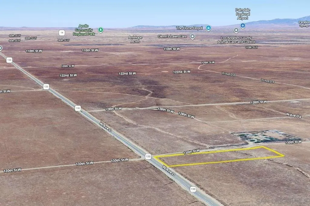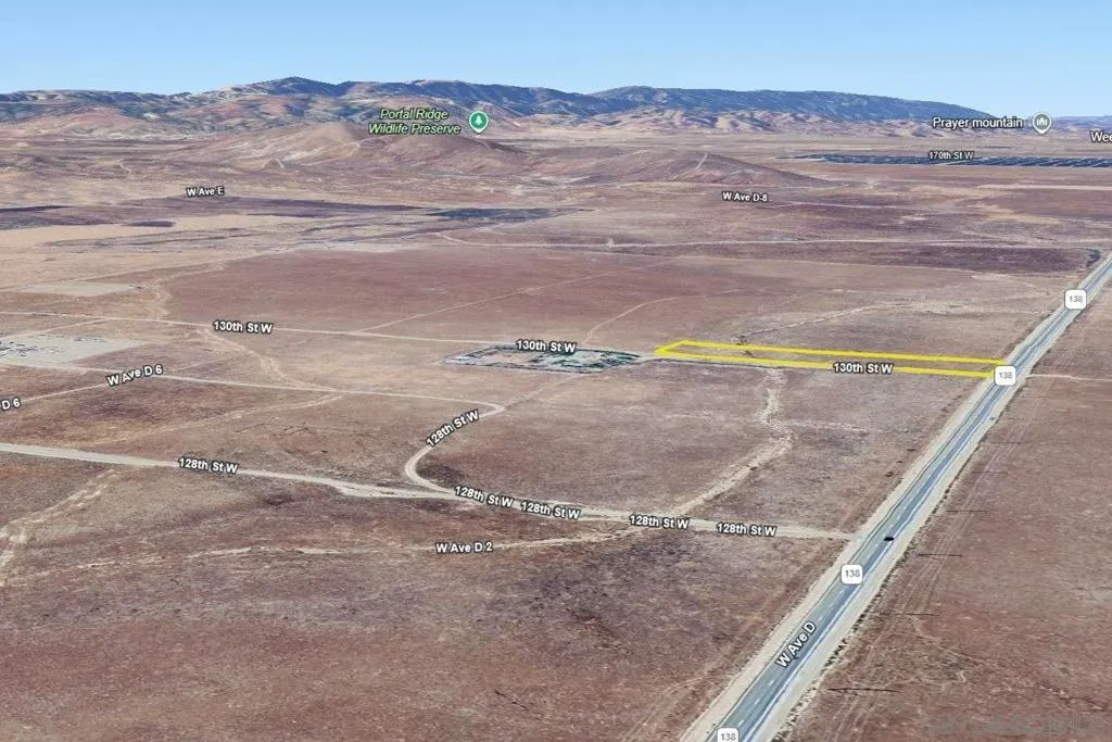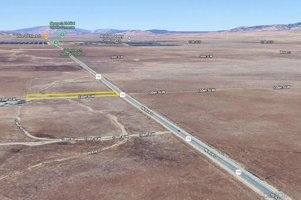 Enjoy wide-open desert views on this 2.39-acre property in Lancaster, Los Angeles County, CA! It sits right along paved W Ave D, giving you easy access to and from town. Power lines are nearby, making future plans more convenient. This location gives you quick access to Antelope Acres, Apollo Community Regional Park, and the Antelope Valley California Poppy Reserve. Lancaster’s shopping, dining, and essential services are all just a short drive away. A great spot for anyone looking for space, fresh air, and room to create their own getaway!