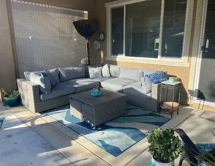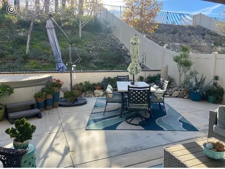 Backyard lush landscaping, shrubbery, grass, covered patio, retaining wall, BBQ area for relaxing.