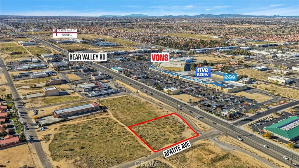 Highly visible commercial corner lot on Bear Valley Road, a major retail and commuter artery in Victorville. This prime site offers two approx half acre lots with excellent frontage, strong traffic exposure, and close proximity to established shopping centers, national brands, grocery stores, and surrounding residential communities that drive consistent consumer traffic. Zoned commercial and well suited for retail, restaurant, medical, or service-oriented uses (buyer to verify), these mostly flat parcels allow for efficient site planning and easy access. Located near Desert Valley Hospital and within a thriving commercial corridor, these properties are an outstanding opportunity for businesses looking to capture visibility, convenience, and a strong customer base.