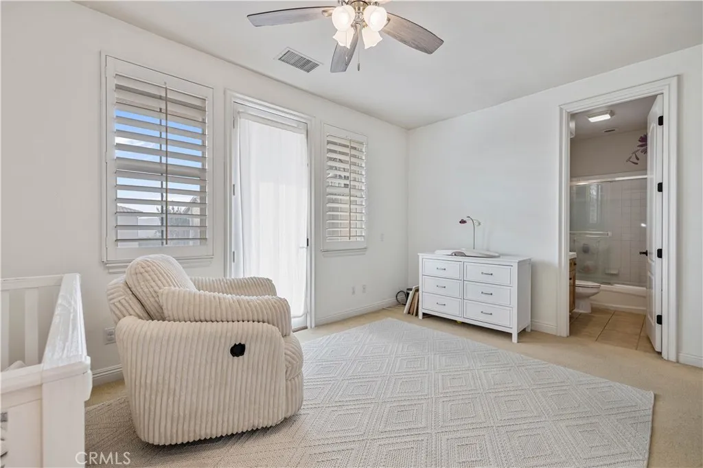 Upstairs, two additional bedrooms, one with access to a private balcony, offer comfortable accommodations. A large multi-purpose room, currently used as a bedroom, provides flexibility for a media room, fitness area, or playroom. The primary suite functions as a private retreat, complete with a sitting area, fireplace, and views of the backyard. The ensuite bathroom includes dual vanities, a soaking tub, an oversized shower, and dual walk-in closets.