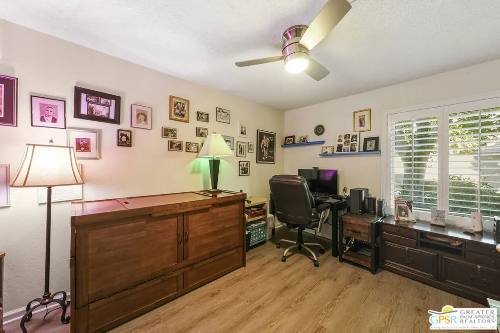 Great opportunity for someone wanting to purchase an income property or 1031 exchange! Seller is looking for a long term leaseback. Fee Simple, prime, ground floor unit in Pueblo Sands with mountain view and laundry. This unit has many upgrades and features that make it unique. Double pane windows and sliding glass doors! A retractable sun shade in the front patio! This unit has a rare gate on the back patio for easy access. Part of the patio was enclosed to create a dining room with french doors. The owner installed a gorgeous buffet with cabinets (butler’s pantry) in the former dining room. The large kitchen and butler’s pantry area have butchers block countertops. There are recessed lights in the kitchen and bathrooms. There is a wall cut out creating an open kitchen and living room concept. There are some smooth ceilings, and a walk in closet. Enjoyable mountain and courtyard veiws from the windows. Pueblo Sands is a gated community with 2 pools, 2 spas, dog park, and clubhouse. It is close to beautiful El Cielo Rd and Tahquitz Canyon Way and the Palm Springs International Airport. Accessible cafe’s, salons and dining by the airport next door or head 2 miles west to Downtown Palm Springs. Easy access to the Smoketree Shopping area and the Gene Autry shopping area. The owner is looking do a seller lease back as a long term tenant. Buyer to verify all details