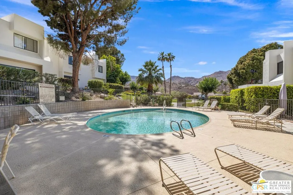 Perfectly Positioned, Updated, and Move-In Ready! This light-filled two-story townhome offers modern style, effortless indoor-outdoor living, and stunning mountain and pool views. Perched just right above the pool, it strikes the ideal balance of privacy and connection with a private path to the pool! The open-concept main level showcases a reimagined kitchen with an oversized island, designer finishes, and seamless flow into the living and dining areas. A gated front courtyard with a fun pass-through to the kitchen adds charm and functionality. Also on the main level are a powder bath and large under-stair storage closet. Upstairs, the updated primary suite features a modern bath and a ceiling-mounted TV that retracts when not in use. A newer laundry area adds convenience to the second level. The guest bedroom, currently used as an office, is located at the opposite end and includes a fully updated bath, offering ideal bedroom separation. Additional highlights include two assigned covered carports, a rare feature in the 120-home Mountainback community. Amenities include tennis, pickleball, pools, + spa. Just minutes from El Paseo’s premier shopping and dining, and close to scenic hiking trails. Low HOA fees. Take the Matterport Virtual Tour to experience the layout and lifestyle this special property offers. Welcome to easy, elevated living in South Palm Desert.