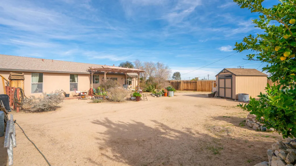 Beautifully appointed Tuscan-inspired 3-bedroom, 2-bath residence offering a bright, open floor plan filled with abundant natural light, ideally situated on an extra-large lot in the heart of Joshua Tree, just a short walk to downtown Joshua Tree Village. Located in a quiet, desirable neighborhood, this thoughtfully designed split-bedroom layout provides both privacy and functionality. From the moment you step through the front doors, the home feels warm, inviting, and welcoming, reflecting timeless Tuscan character blended with desert charm.The home features a grand exterior entry and showcases vaulted ceilings, elegant barrel rolls, bullnosed walls throughout, ceiling fans, and a built-in entertainment niche, creating a comfortable and refined living environment.The spacious primary suite includes a customized walk-in closet and an en-suite bathroom with dual sinks. The well-appointed kitchen highlights Tuscan stone tile countertops, porcelain tile flooring, a pantry, and a breakfast bar–ideal for both everyday living and entertaining. The guest bathroom is finished with Corian countertops, and dual-pane windows throughout enhance energy efficiency and year-round comfort.Additional features include natural gas heating, central air conditioning, and an oversized, fully finished two-car garage. The backyard offers a concrete patio with pergola just off the kitchen, mature landscaping with fruit trees, scenic views of surrounding rock formations, and a detached 8 ft x 12 ft insulated storage shed, perfect for additional storage or workspace. Exterior improvements include a concrete driveway, walkway, and patio, while the open interior layout maximizes natural light and livability.Enjoy exceptional stargazing from your own backyard–one of the true hallmarks of the Joshua Tree lifestyle.Buyer to independently investigate and verify all information, including but not limited to square footage, lot size, permits, zoning, utilities, property condition, and intended use. Listing agent and broker make no representations or warranties regarding the accuracy of information provided. Buyer is advised to rely on their own investigations and inspections.