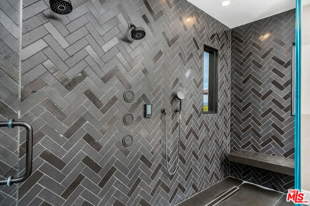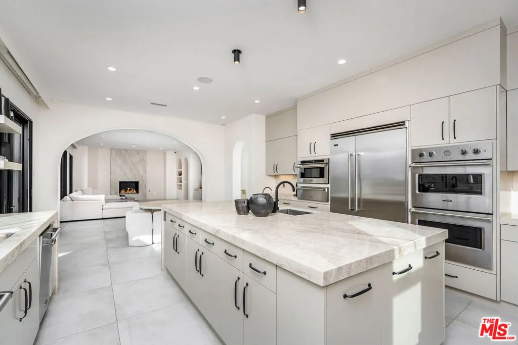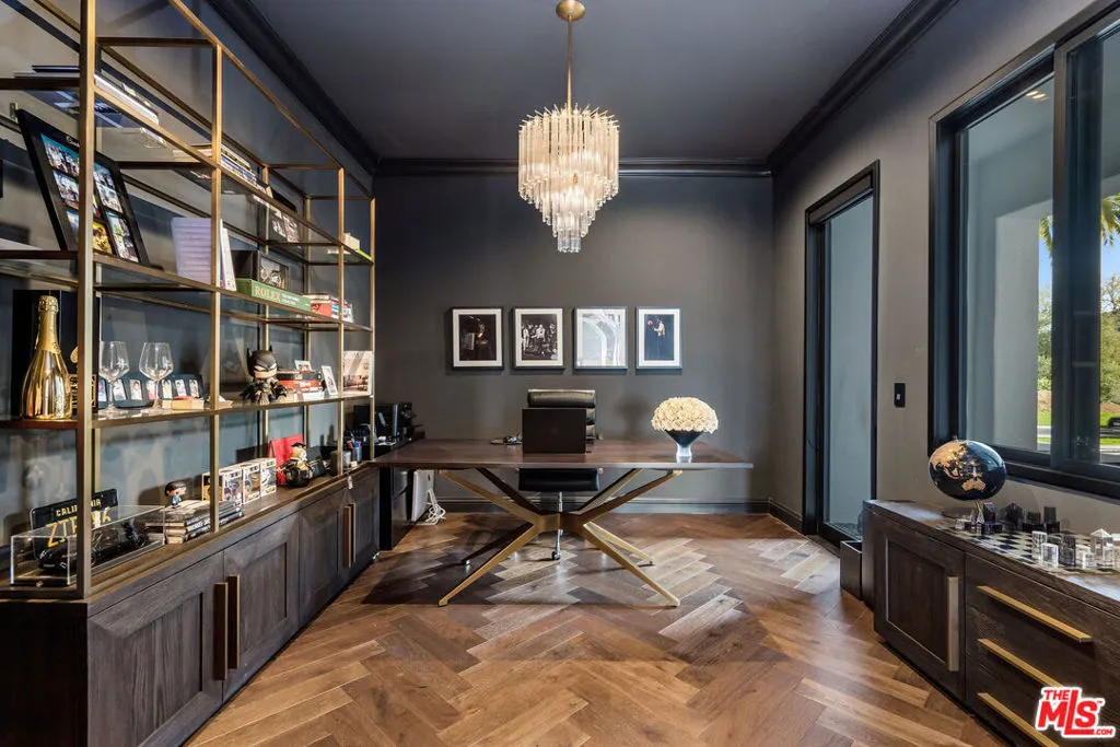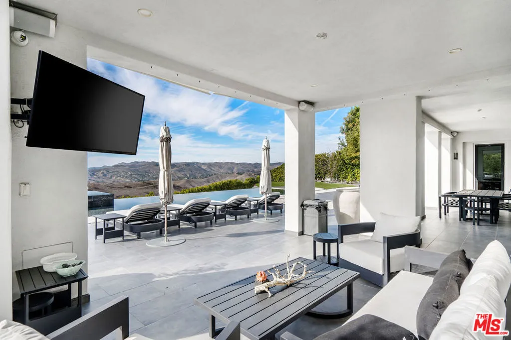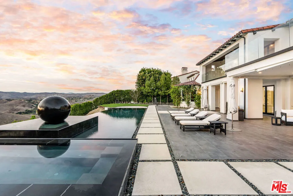 Beyond the guard gates at The Oaks at Calabasas lies an extraordinary pedigree of luxury and style, set on a premier view lot with endless horizons. This notable Laing Luxury Model 2 estate has been reimagined with an elevated organic modern aesthetic, blending minimal sophistication with exceptional designer finishes. Nearly 7,000 square feet of contemporary luxury, this home showcases a brand-new kitchen with custom cabinetry, exquisite Taj Mahal slabs, a striking waterfall island, and beautiful finishes. Modern stone flooring flows throughout the main level, while timeless French oak hardwood graces the second floor. The expansive living room features a custom focal fireplace wall, seamlessly open to the formal dining space and an elegant bistro patio. The generously sized family room connects effortlessly to the kitchen and breakfast dinette, creating an inviting and functional living space. A dedicated bonus room is fully equipped with an incredible home theater and pool table, offering the perfect space for entertainment. Five ensuite bedrooms include one on the main level, while the grand primary suite is a tranquil retreat. The newly designed primary spa bath is a masterpiece, featuring an oversized shower with chevron-pattern stone finishes, floating vanities, ambient lighting, and a pedestal tub. The large custom walk-in closet is both spacious and functional, designed for ultimate convenience. Step outside into a resort-style paradise, where breathtaking views set the stage for an exceptional outdoor experience. The zero-edge infinity pool and spa seamlessly blend with the horizon, while a sunken fire pit seating area at water level creates the ultimate modern luxury ambiance. Every detail of this estate has been thoughtfully curated to embody both moody elegance and contemporary sophistication.