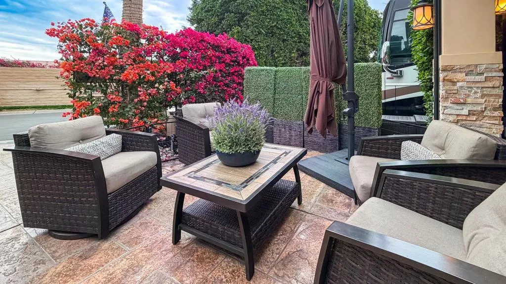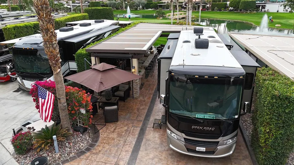 Outdoor Resort Indio is a Class A Motorcoach resort. This is an RV lot. Lot #239 at Outdoor Resort Indio is a thoughtfully designed RV resort lot offering privacy, golf course, lake, and mountain views, along with inviting outdoor living. A five-year-old, well-anchored roof covers a beautiful L-shaped Alumawood pergola with stacked stone pillars, enhanced by abundant recessed lighting and a generous front covered area–perfect for storing chairs and cushions during the rare desert rain.The outdoor kitchen includes granite countertops with a wrap-around bar, all-stainless appliances, a built-in Blaze BBQ and refrigerator, oven, dishwasher, hot water, garbage disposal, and ample storage. A TV on a Televator swivels for ideal viewing, while three electric screens, two ceiling fans, and three ceiling heaters provide year-round comfort.The stamped and sealed concrete RV pad and kitchen area create a clean, finished look. Enjoy golf course, lake, fountain, and bridge views with stunning sunsets, all without walk-by golfers or motorcoaches across the street. A private front seating area with bougainvillea hedges–maintained by the HOA–offers a peaceful spot for morning coffee. Partially furnished and pet-friendly, with a dog area directly across the lot, this is a quiet, private setting ideal for relaxed resort living.