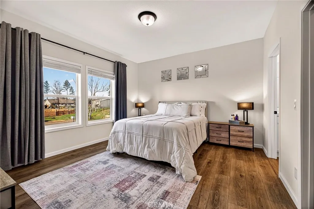The private primary suite includes a walk-in closet and a modern en-suite bathroom with a dual-sink solid-surface vanity and a step-in shower with sleek black-framed glass. On the opposite end, you’ll find a guest bedroom, a versatile bonus room suitable for a home office or additional bedroom, and a full guest bathroom.