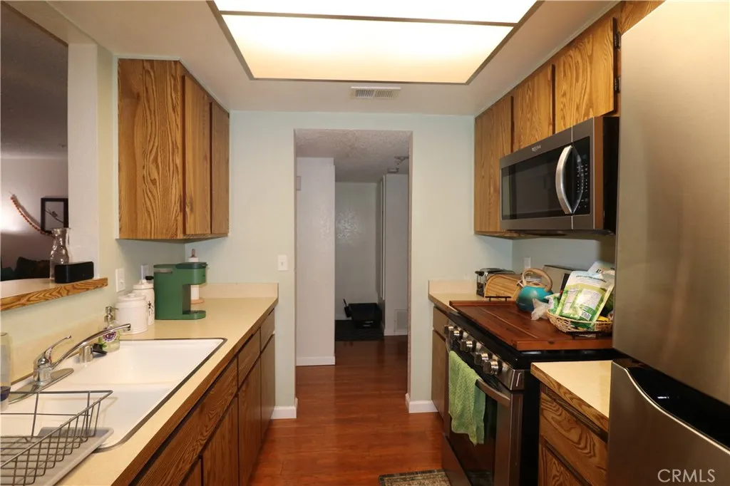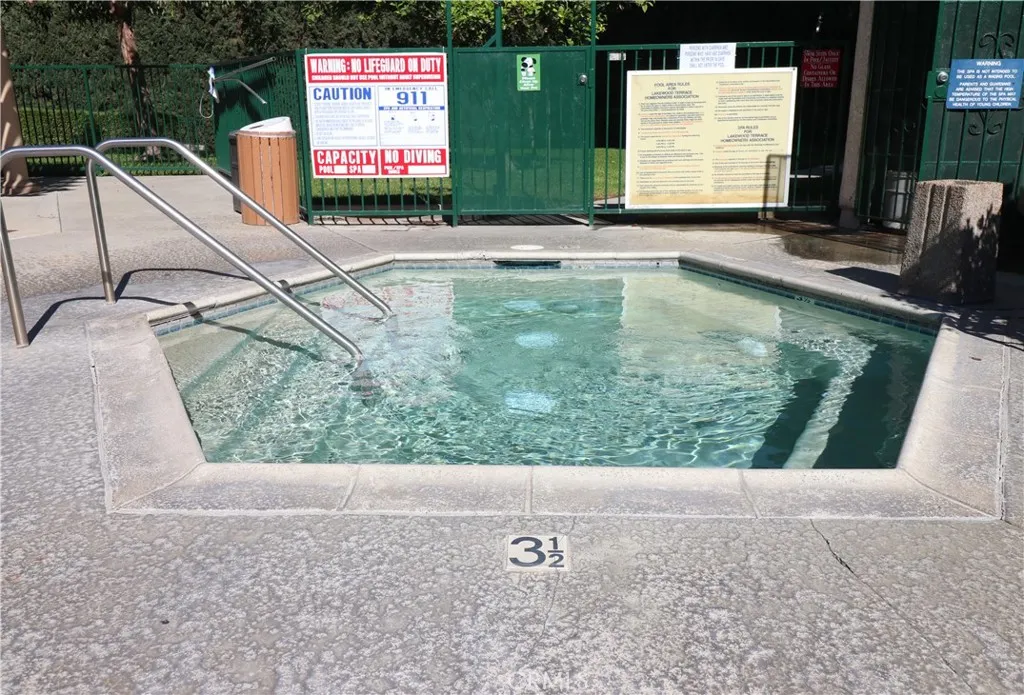 Welcome home! This end unit 1 bedroom/1 bath, 731 (ASR) square foot condominium is located on the ground floor of the highly desirable community of Lakewood Terrace. It comes with two parking spots, one subterranean and one reserved outdoor, as well as plenty of parking for your guests with 3 visitor parking lots and abundant street parking. The building has an elevator, so there is no need to carry your groceries up the stairs. Upon entering, you will notice how roomy this home is with beautiful cherry wood laminate flooring throughout. Leave your coat in the entryway closet and walk in to your open concept living room and dining area, with plenty of space for entertaining. The kitchen features cabinets galore and plenty of counter space. The large bedroom has enough space for a corner office for those who work from home or a quiet sitting area to relax after a long day. The powder room off the bedroom has beautiful tile and features dual doors for entrance from either the bedroom or living room, allowing you privacy. Newer dual pane windows, including a sliding glass door off the bedroom lead to a large covered balcony. An additional storage closet can be accessed from the balcony, perfect for holiday decorations or your outdoor essentials. Enjoy year round comfort inside with central heating and AC, as well as a washer and dryer located in unit for convenient laundry on your time. Finally, step out to enjoy the beautiful pool and spa area, great for relaxing or entertaining.
