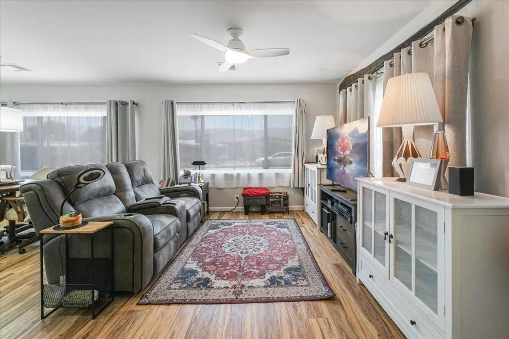 Solar is Paid and included in Sale!! All the upgrading has been done for you! Enjoy Free Golf with ownership!This home is ready for you to move in and start enjoying desert living in Palm Desert Greens Country Club. Enjoy the remodeled features which include reinforcement of home for drywall installation, 51% UV Dual Pane Windows, and paid for Solar to keep you comfortable all year long. The roof was installed in 2020 and the solar was added in 2023. The Air Conditioner received a new motor in 2025. Financing is made convenient with a permanent foundation. The Open Floor Plan gives the spacious feeling upon entering! Beautiful Laminated flooring throughout accents the centerpiece Gourmet Kitchen. Stainless Steel Appliances, Quartz Counter Tops, and plenty of storage in the beautiful cabinets are the centerpiece of the home. The dining area lets you enjoy the mountain view and has a large built-in hutch for more storage. With two large front windows the light flows in while you enjoy the view. Rest in the primary suite at the rear of the home with an upgraded bathroom. The guest bedroom is across from the guest bathroom and a great location for company. The large outside patio has golf cart parking & the lots of room for entertaining. Seller is Motivated, Call for a tour