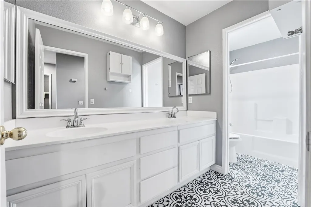 The primary suite is a sanctuary of its own, highlighted by dual walk-in closets, dual-sink vanities, a spa-inspired walk-in shower, and a separate jetted soaking tub designed for true relaxation. Secondary bathrooms echo the same attention to detail, featuring dual vanities and tasteful finishes throughout.