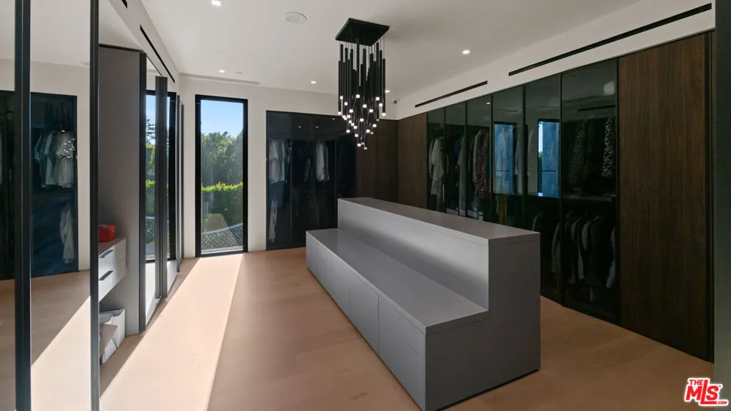 Rising above the city like a goddess in the sky, this modern estate commands sweeping city and skyline views while remaining firmly rooted in Beverly Hills proper. Elevated without isolation and impressive without excess, it offers a rare balance of prestige, privacy, and true family livability designed to resonate with the world’s most discerning buyers while functioning beautifully as a primary residence. Designed by acclaimed architect Thomas Schoos, the home reflects architectural discipline, proportion, and permanence. Arrival is defined by a gated half-moon driveway that allows guests to gracefully circle the residence, while also providing immediate, direct access into an expansive subterranean garage accommodating eight or more vehicles ideal for everyday convenience and for those who value meaningful garage space without sacrificing elegance at the front of the home. The estate is anchored by a full concrete and steel foundation with engineered lumber and structural steel framing, delivering exceptional seismic integrity and long-term durability. Fire-treated materials, high-density insulation, Starfire low-iron glass, a TPO roof with integrated Tesla solar, custom Arcadia metal windows and doors, Mitsubishi VRF zoned climate control, a comprehensive Crestron automation system, and a rare commercial-grade high-speed elevator underscore the home’s commitment to performance, comfort, and longevity. Inside, the residence unfolds as a seamless blend of architectural statement and everyday function. A dramatic 35-foot architectural concrete wall and sculptural floating staircase anchor the interiors, while the main living level opens entirely through a commanding 50-foot motorized sliding glass wall, creating effortless indoor-outdoor flow. The chef’s kitchen features custom Italian Snaidero cabinetry, a full Wolf, Sub-Zero, and Cove appliance suite, and a concealed catering kitchen designed for refined entertaining without disruption. The lower level offers a complete lifestyle environment, including a naturally lit subterranean garage, private screening room, entertainment and game lounge, multiple bars, wine room, guest or staff accommodations, and a fully equipped indoor-outdoor gym. The primary suite serves as a calm retreat with expansive Italian porcelain finishes, a spa-caliber steam shower, refined fixtures, and a private morning bar, while secondary bedrooms and baths are equally well-appointed with designer stone, premium fittings, and intelligent Kohler systems. Outdoors, the estate becomes a true family compound, featuring lush green lawns, a private sport court, and a multi-hole putting green creating rare, usable outdoor space for children, teens, and adults alike. A 55-foot quartz-finished infinity-edge pool and spa, expansive terraces with integrated heating and sound, and unobstructed city views complete the experience. Set moments from the Beverly Hills Hotel and a short drive to the boutiques, dining, and cultural heart of Rodeo Drive, this architecturally significant estate delivers a globally relevant standard of modern living prestigious yet welcoming, powerful yet livable, and designed for both today and legacy.