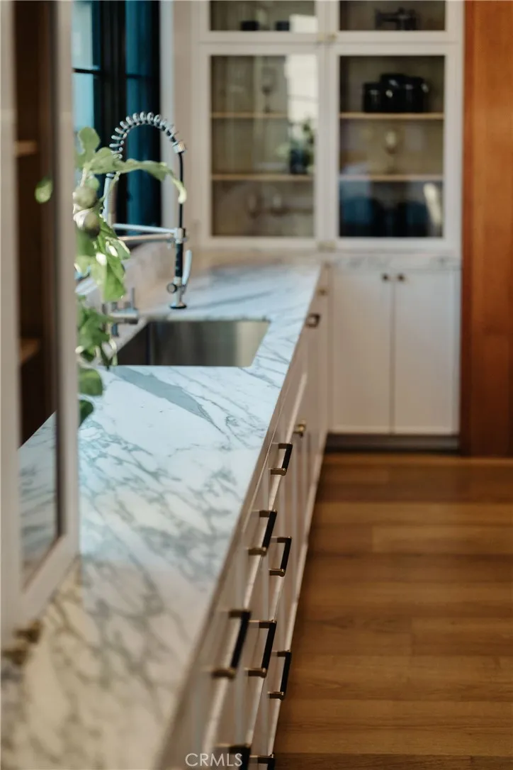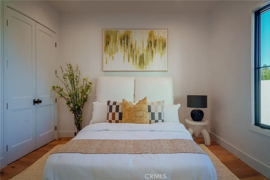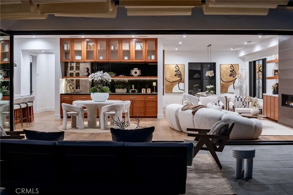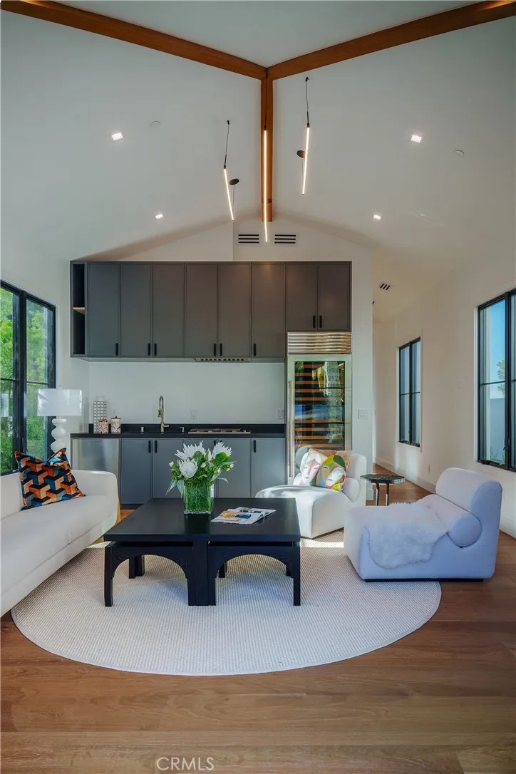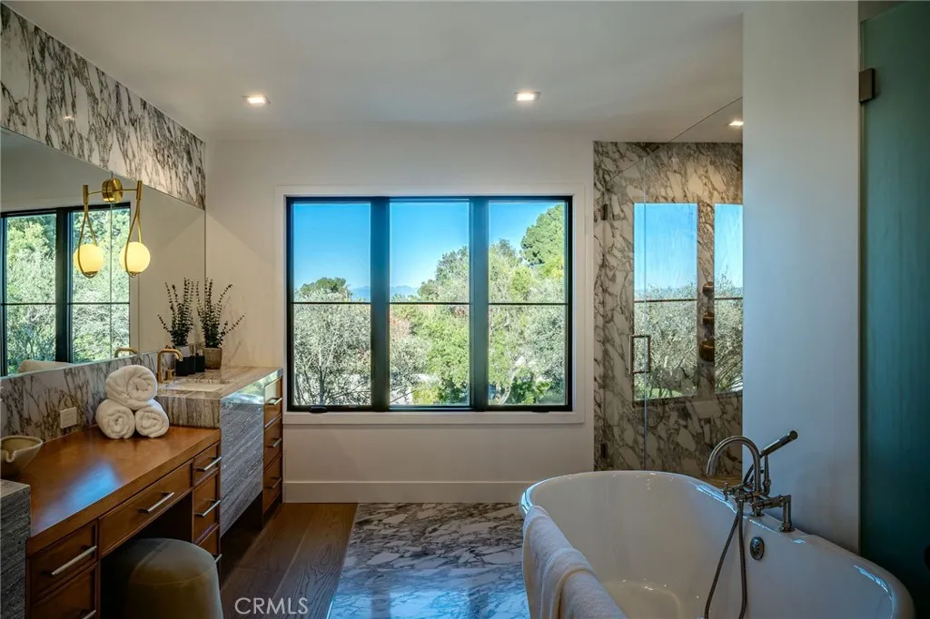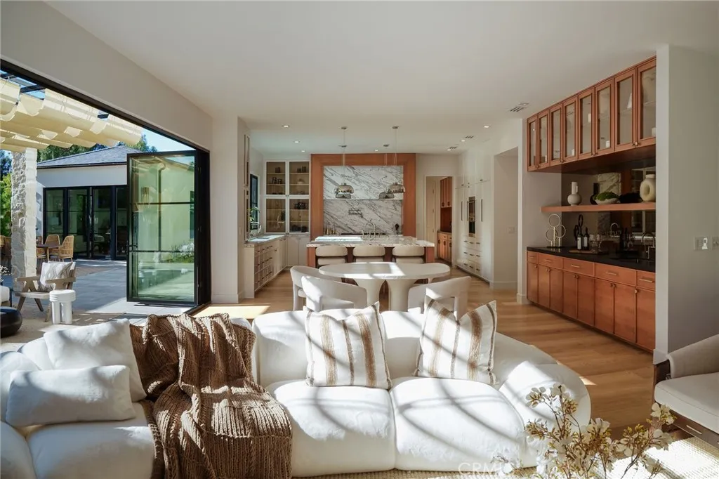 The main residence offers five bedrooms and four-and-a-half baths, complemented by a detached one-bedroom, one-bath ADU featuring its own living area, bonus space, and private laundry. Wide-plank European white oak floors lend warmth throughout, while the chef’s kitchen completes with dual islands, Statuario Venato marble, and premium stainless-steel appliances to strikes a perfect balance between form and function. Aluminum-clad windows and doors flood the interiors with natural light and define the home’s clean architectural lines.