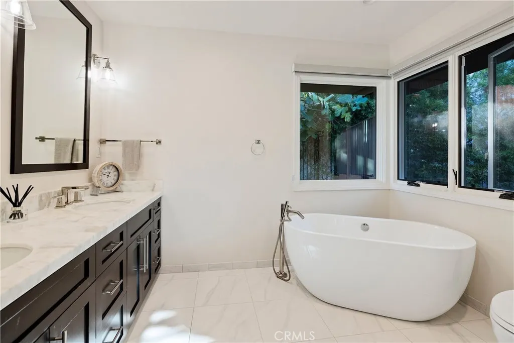 All bedrooms include en-suite baths, with private upstairs and downstairs suites well suited for guests or multi-generational living. The primary suite serves as a tranquil retreat with ocean views, a custom walk-in closet, and a spa-inspired bath with marble finishes and a freestanding soaking tub.