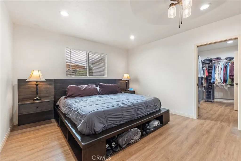 Recessed lighting and ceiling fan in primary suite